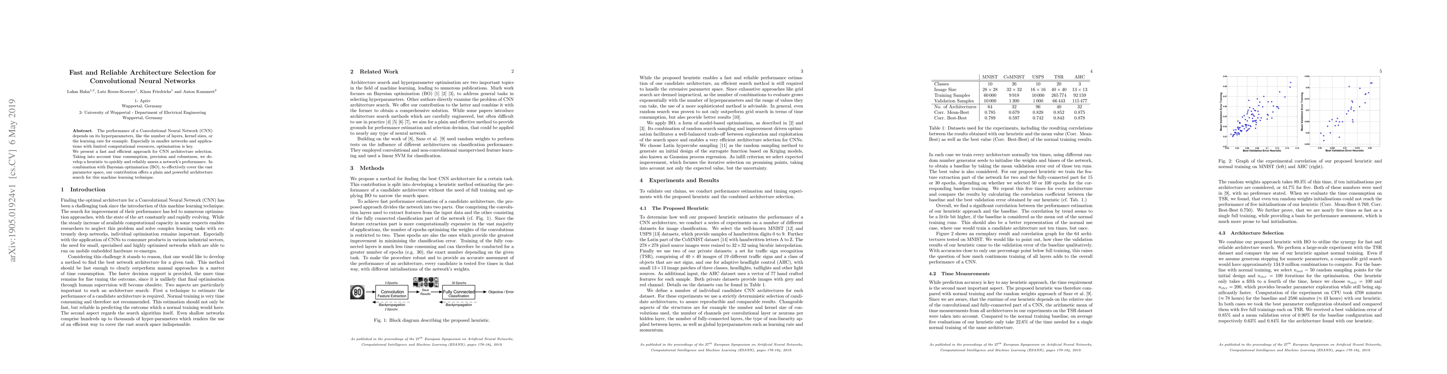 This paper introduces a fast and efficient approach to selecting Convolutional Neural Network architectures that balances performance, robustness, and computational efficiency. It combines Bayesian optimization with a heuristic method to quickly assess network performance and cover the vast parameter space.