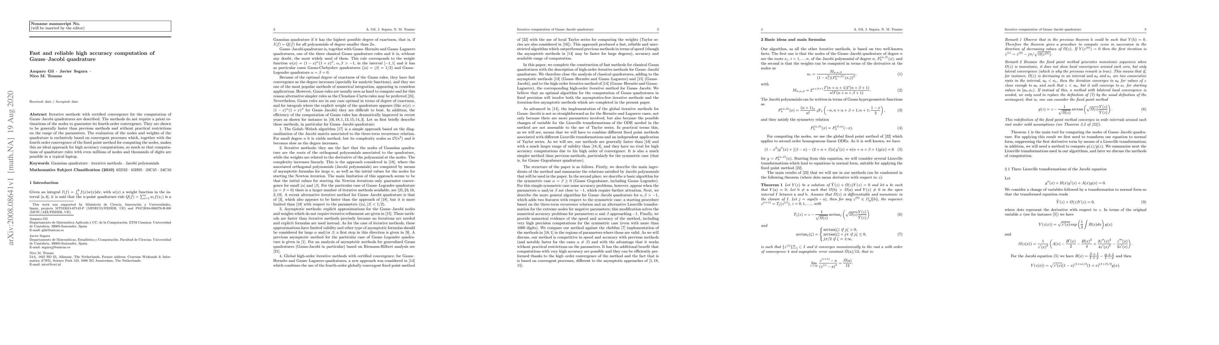 This paper presents iterative methods for computing Gauss-Jacobi quadratures with certified fourth-order convergence, faster than previous techniques, and without prior node estimations. These methods enable high accuracy computations, even for millions of nodes and thousands of digits, on a typical laptop.