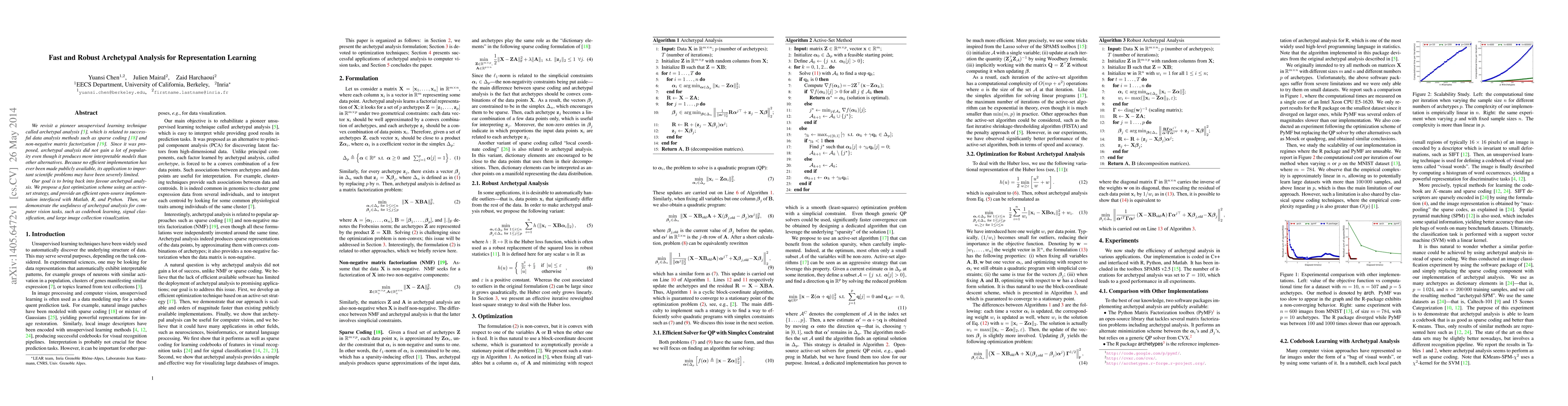 We revisit a pioneer unsupervised learning technique called archetypal analysis, which is related to successful data analysis methods such as sparse coding and non-negative matrix factorization. Since it was proposed, archetypal analysis did not gain a lot of popularity even though it produces more interpretable models than other alternatives. Because no efficient implementation has ever been made publicly available, its application to important scientific problems may have been severely limited. Our goal is to bring back into favour archetypal analysis. We propose a fast optimization scheme using an active-set strategy, and provide an efficient open-source implementation interfaced with Matlab, R, and Python. Then, we demonstrate the usefulness of archetypal analysis for computer vision tasks, such as codebook learning, signal classification, and large image collection visualization.