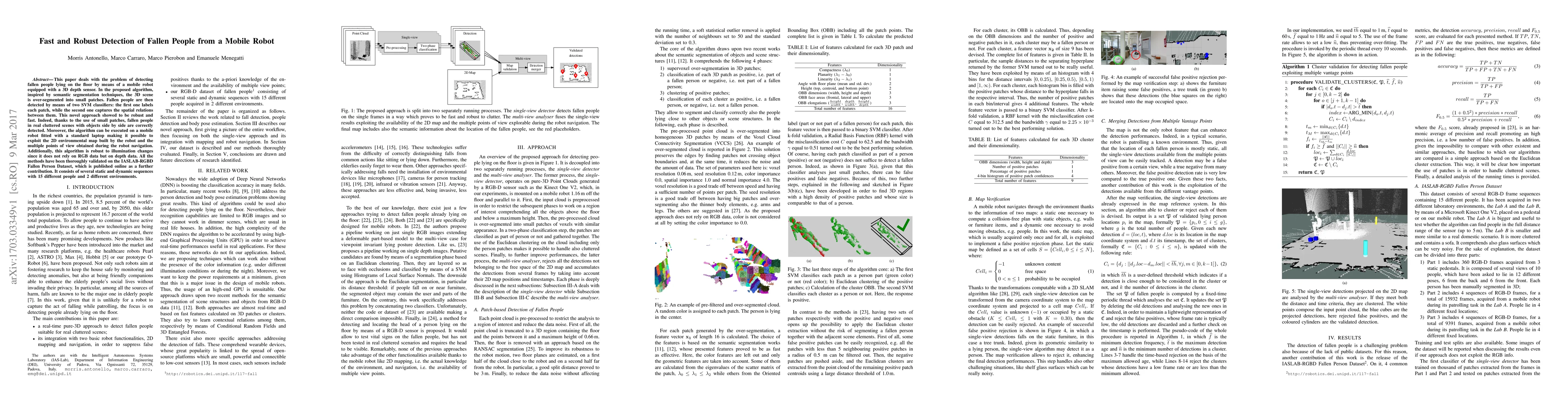 A mobile robot equipped with a 3D depth sensor uses semantic segmentation to quickly and robustly detect fallen people in cluttered scenes. The algorithm is fast, robust to illumination changes, and can utilize environmental maps and multiple viewpoints.