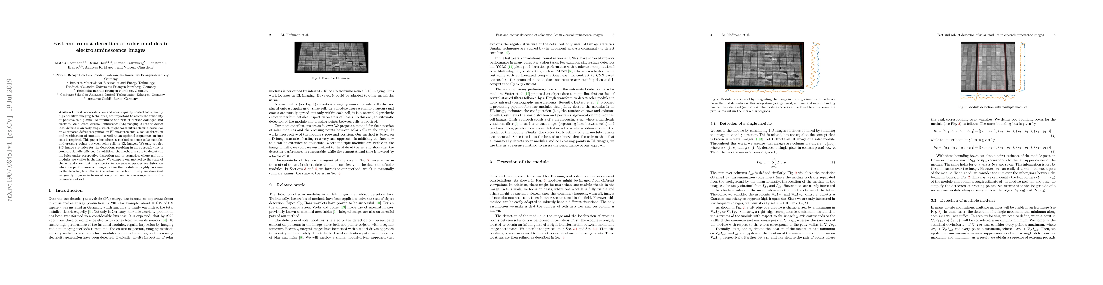 Fast, non-destructive and on-site quality control tools, mainly high sensitive imaging techniques, are important to assess the reliability of photovoltaic plants. To minimize the risk of further damages and electrical yield losses, electroluminescence (EL) imaging is used to detect local defects in an early stage, which might cause future electric losses. For an automated defect recognition on EL measurements, a robust detection and rectification of modules, as well as an optional segmentation into cells is required. This paper introduces a method to detect solar modules and crossing points between solar cells in EL images. We only require 1-D image statistics for the detection, resulting in an approach that is computationally efficient. In addition, the method is able to detect the modules under perspective distortion and in scenarios, where multiple modules are visible in the image. We compare our method to the state of the art and show that it is superior in presence of perspective distortion while the performance on images, where the module is roughly coplanar to the detector, is similar to the reference method. Finally, we show that we greatly improve in terms of computational time in comparison to the reference method.