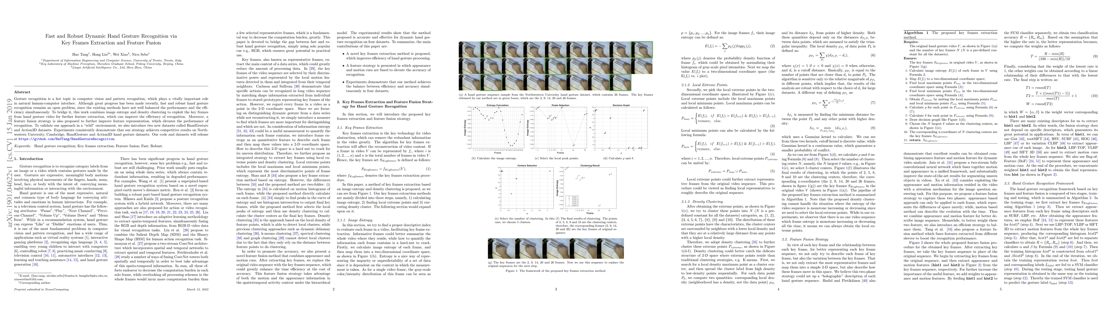 Gesture recognition is a hot topic in computer vision and pattern recognition, which plays a vitally important role in natural human-computer interface. Although great progress has been made recently, fast and robust hand gesture recognition remains an open problem, since the existing methods have not well balanced the performance and the efficiency simultaneously. To bridge it, this work combines image entropy and density clustering to exploit the key frames from hand gesture video for further feature extraction, which can improve the efficiency of recognition. Moreover, a feature fusion strategy is also proposed to further improve feature representation, which elevates the performance of recognition. To validate our approach in a "wild" environment, we also introduce two new datasets called HandGesture and Action3D datasets. Experiments consistently demonstrate that our strategy achieves competitive results on Northwestern University, Cambridge, HandGesture and Action3D hand gesture datasets. Our code and datasets will release at https://github.com/Ha0Tang/HandGestureRecognition.