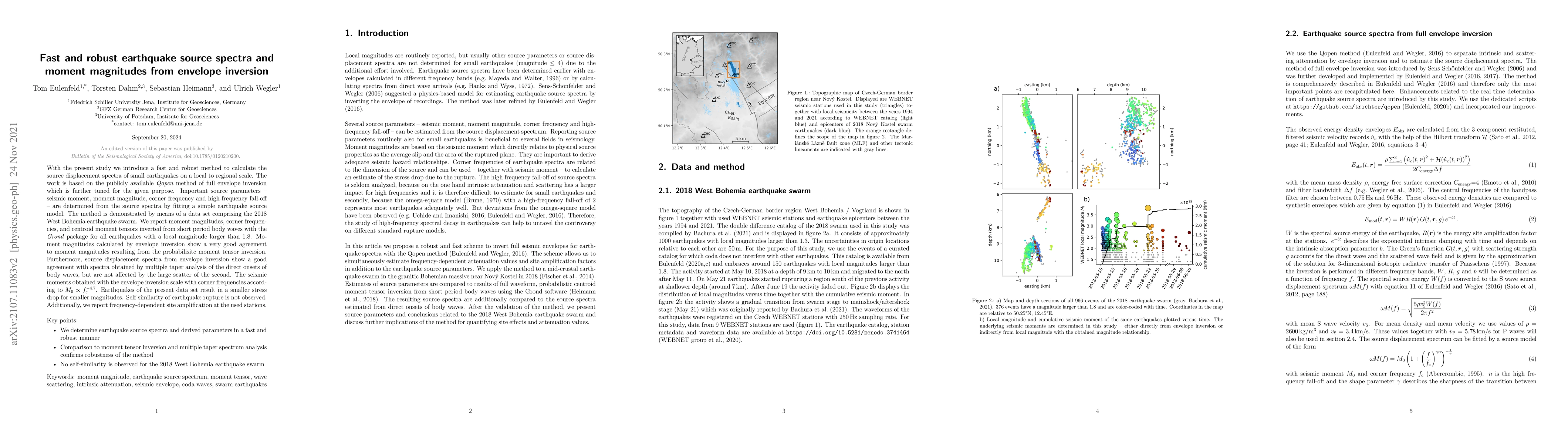 With the present study we introduce a fast and robust method to calculate the source displacement spectra of small earthquakes on a local to regional scale. The work is based on the publicly available Qopen method of full envelope inversion which is further tuned for the given purpose. Important source parameters -- seismic moment, moment magnitude, corner frequency and high-frequency fall-off -- are determined from the source spectra by fitting a simple earthquake source model. The method is demonstrated by means of a data set comprising the 2018 West Bohemia earthquake swarm. We report moment magnitudes, corner frequencies, and centroid moment tensors inverted from short period body waves with the Grond package for all earthquakes with a local magnitude larger than 1.8. Moment magnitudes calculated by envelope inversion show a very good agreement to moment magnitudes resulting from the probabilisitc moment tensor inversion. Furthermore, source displacement spectra from envelope inversion show a good agreement with spectra obtained by multiple taper analysis of the direct onsets of body waves, but are not affected by the large scatter of the second. The seismic moments obtained with the envelope inversion scale with corner frequencies according to $M_0 \propto f_{\mathrm{c}}^{-4.7}$. Earthquakes of the present data set result in a smaller stress drop for smaller magnitudes. Self-similarity of earthquake rupture is not observed. Additionally, we report frequency-dependent site amplification at the used stations.