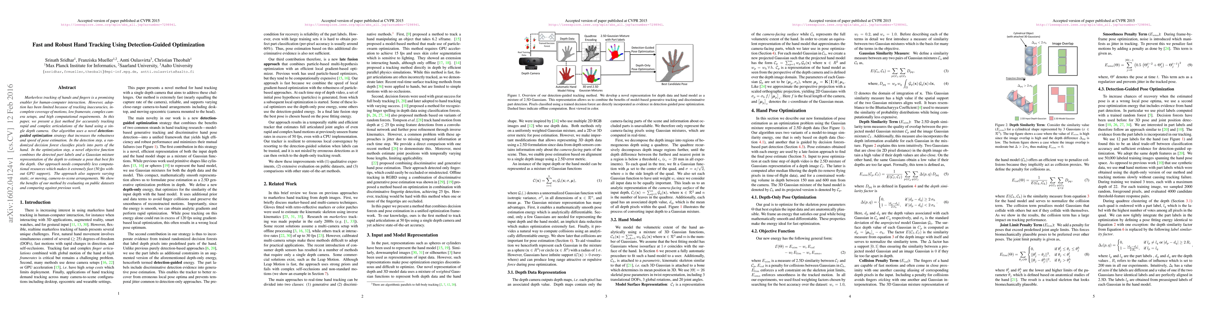 This paper proposes a fast and robust hand tracking method using a single depth camera, employing a detection-guided optimization strategy that enhances pose estimation speed and accuracy. The method leverages a randomized decision forest for initial hand part classification and an optimized objective function for pose estimation, achieving 50 fps without GPU support.