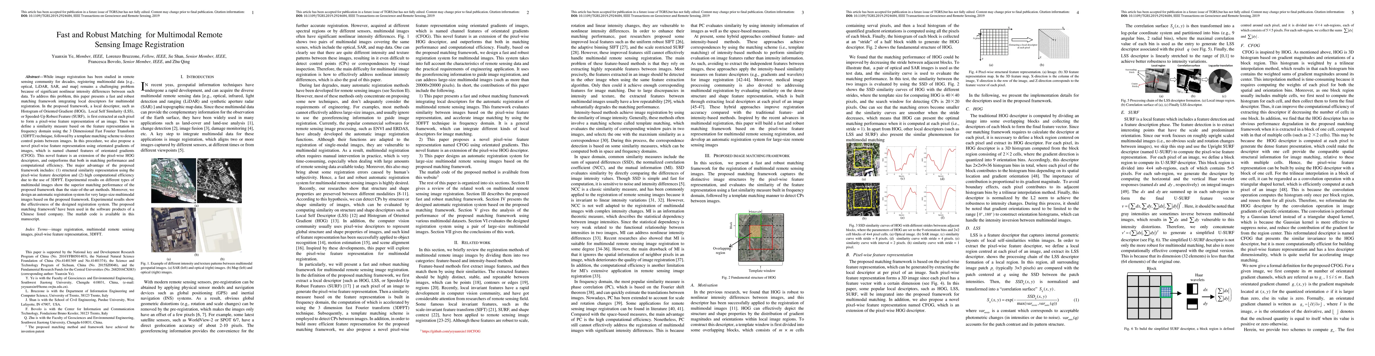 This paper presents a fast and robust framework for multimodal remote sensing image registration using local descriptors and 3D Fast Fourier Transform (3DFFT) for efficient matching. The proposed method, which includes a novel channel features of orientated gradients (CFOG), outperforms existing methods in both performance and computational efficiency.