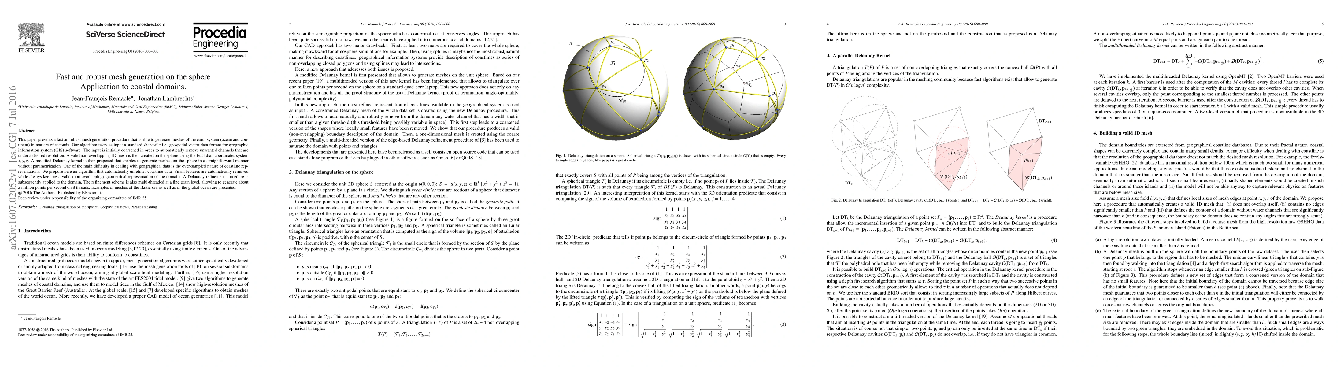 This paper presents a fast an robust mesh generation procedure that is able to generate meshes of the earth system (ocean and continent) in matters of seconds. Our algorithm takes as input a standard shape-file i.e. geospatial vector data format for geographic information system (GIS) software. The input is initially coarsened in order to automatically remove unwanted channels that are under a desired resolution. A valid non-overlapping 1D mesh is then created on the sphere using the Euclidian coordinates system $x,y,z$. A modified Delaunay kernel is then proposed that enables to generate meshes on the sphere in a straightforward manner without parametrization. One of the main difficulty in dealing with geographical data is the over-sampled nature of coastline representations. We propose here an algorithm that automatically unrefines coastline data. Small features are automatically removed while always keeping a valid (non-overlapping) geometrical representation of the domain. A Delaunay refinement procedure is subsequently applied to the domain. The refinement scheme is also multi-threaded at a fine grain level, allowing to generate about a million points per second on 8 threads. Examples of meshes of the Baltic sea as well as of the global ocean are presented.
