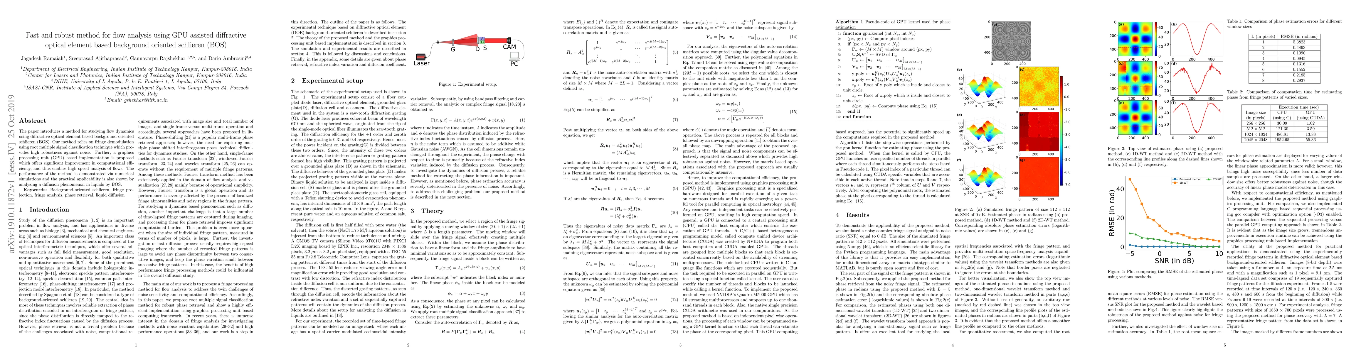 This paper presents a GPU-assisted method for flow analysis using diffractive optical elements in background-oriented schlieren (BOS), employing root multiple signal classification for noise robustness and achieving high computational efficiency for rapid flow dynamics studies. The method's effectiveness is validated through numerical simulations and practical analysis of diffusion in liquids.