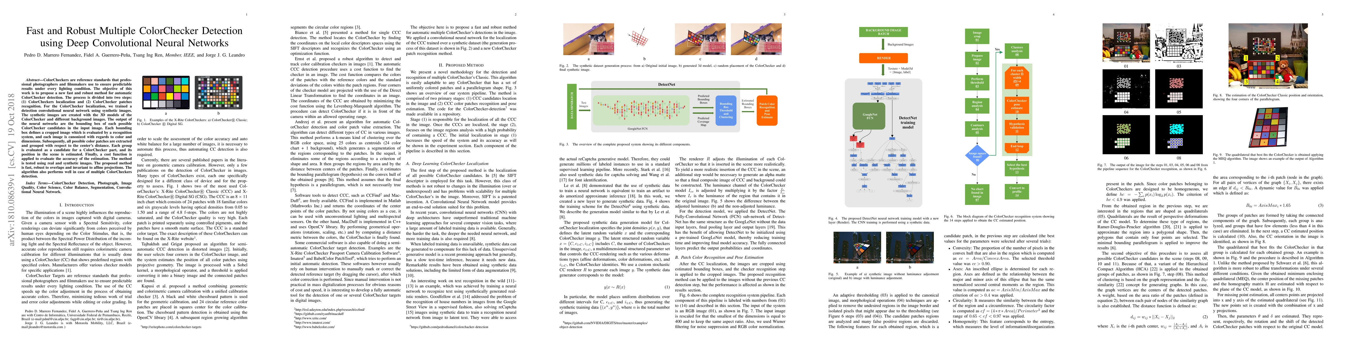A deep convolutional neural network is proposed for fast and robust ColorChecker detection, achieving high accuracy in localization and recognition of patches, even with overlaps and affine projections.