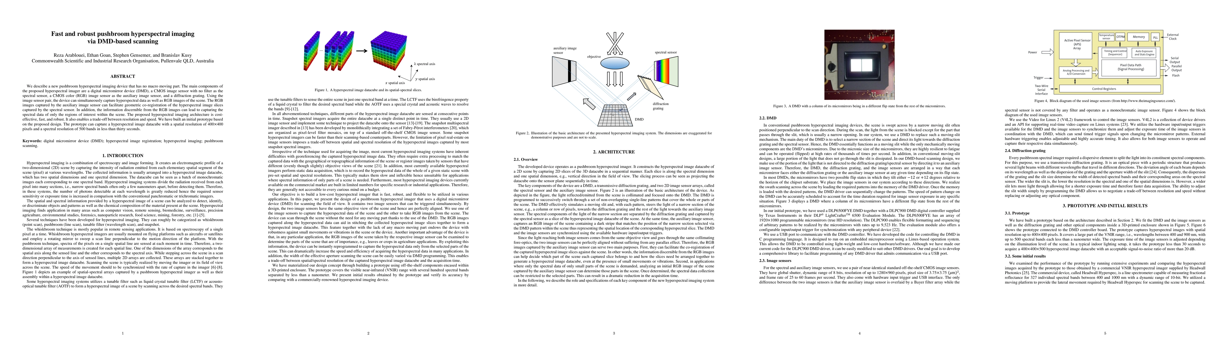 This paper introduces a novel pushbroom hyperspectral imaging device utilizing a DMD for scanning without moving parts, enabling rapid and robust hyperspectral data capture. The system combines a CMOS spectral sensor and an RGB sensor to enhance co-registration and focus on regions of interest, achieving a datacube in under thirty seconds.