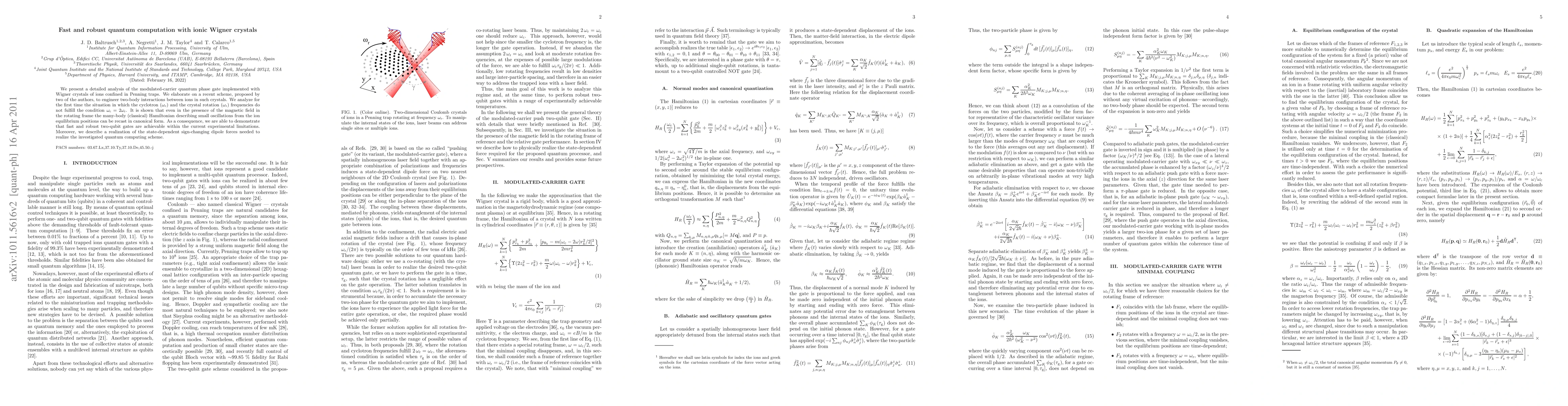 We present a detailed analysis of the modulated-carrier quantum phase gate implemented with Wigner crystals of ions confined in Penning traps. We elaborate on a recent scheme, proposed by two of the authors, to engineer two-body interactions between ions in such crystals. We analyze for the first time the situation in which the cyclotron (w_c) and the crystal rotation (w_r) frequencies do not fulfill the condition w_c=2w_r. It is shown that even in the presence of the magnetic field in the rotating frame the many-body (classical) Hamiltonian describing small oscillations from the ion equilibrium positions can be recast in canonical form. As a consequence, we are able to demonstrate that fast and robust two-qubit gates are achievable within the current experimental limitations. Moreover, we describe a realization of the state-dependent sign-changing dipole forces needed to realize the investigated quantum computing scheme.