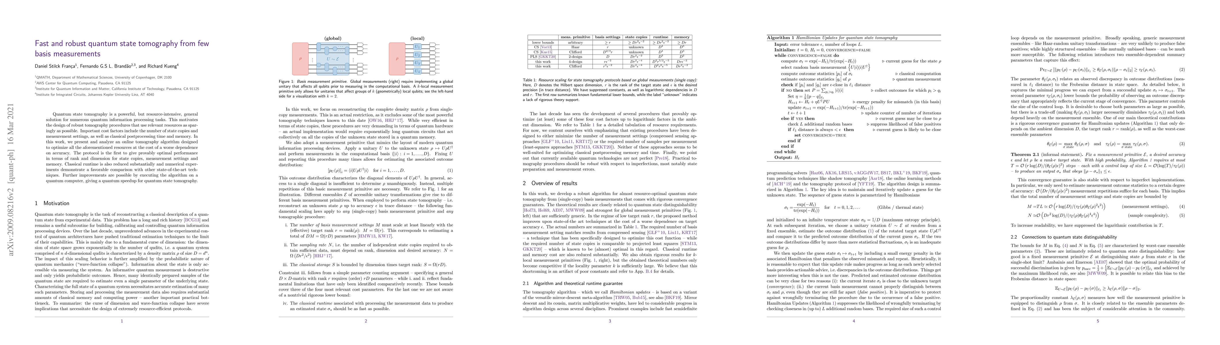 Quantum state tomography is a powerful, but resource-intensive, general solution for numerous quantum information processing tasks. This motivates the design of robust tomography procedures that use relevant resources as sparingly as possible. Important cost factors include the number of state copies and measurement settings, as well as classical postprocessing time and memory. In this work, we present and analyze an online tomography algorithm designed to optimize all the aforementioned resources at the cost of a worse dependence on accuracy. The protocol is the first to give provably optimal performance in terms of rank and dimension for state copies, measurement settings and memory. Classical runtime is also reduced substantially and numerical experiments demonstrate a favorable comparison with other state-of-the-art techniques. Further improvements are possible by executing the algorithm on a quantum computer, giving a quantum speedup for quantum state tomography.