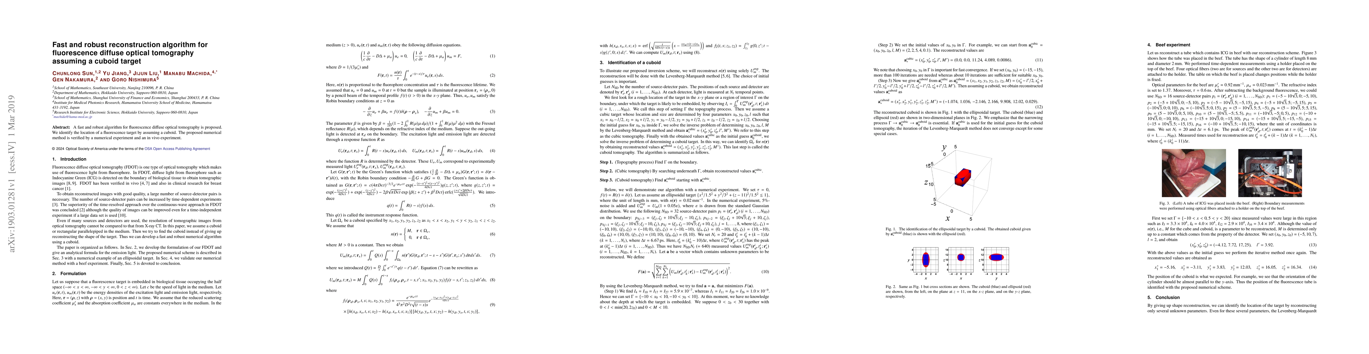 This paper proposes a fast and robust algorithm for fluorescence diffuse optical tomography, focusing on locating a fluorescence target within a cuboid. The method is validated through both numerical and in vivo experiments.
