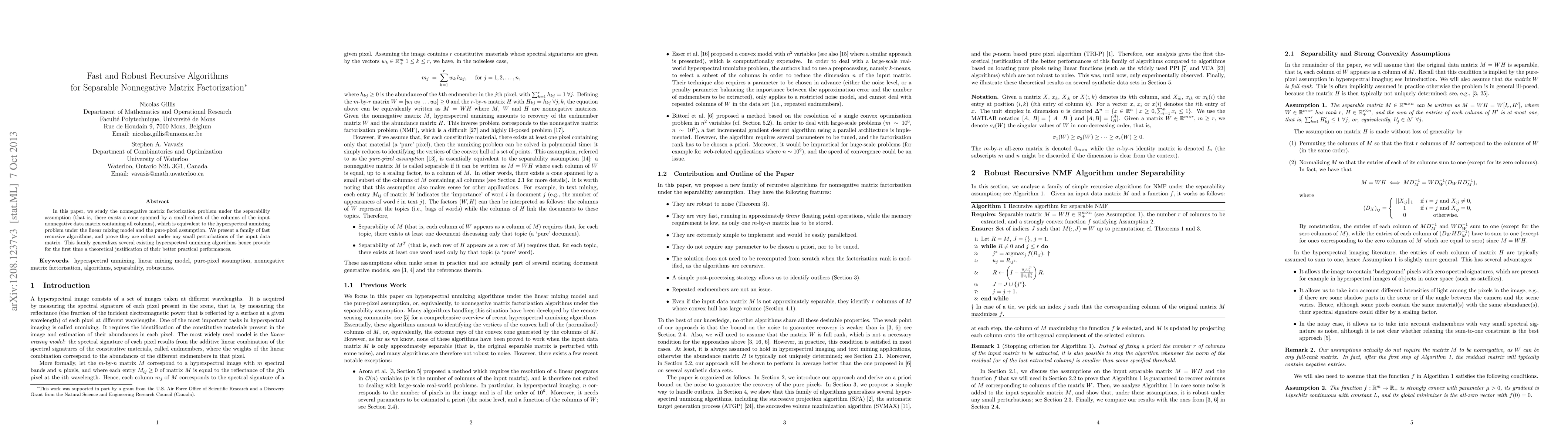 This paper introduces fast recursive algorithms for separable nonnegative matrix factorization, addressing the hyperspectral unmixing problem. The algorithms are proven to be robust against small perturbations and generalize existing methods, offering a theoretical basis for their improved practical performance.