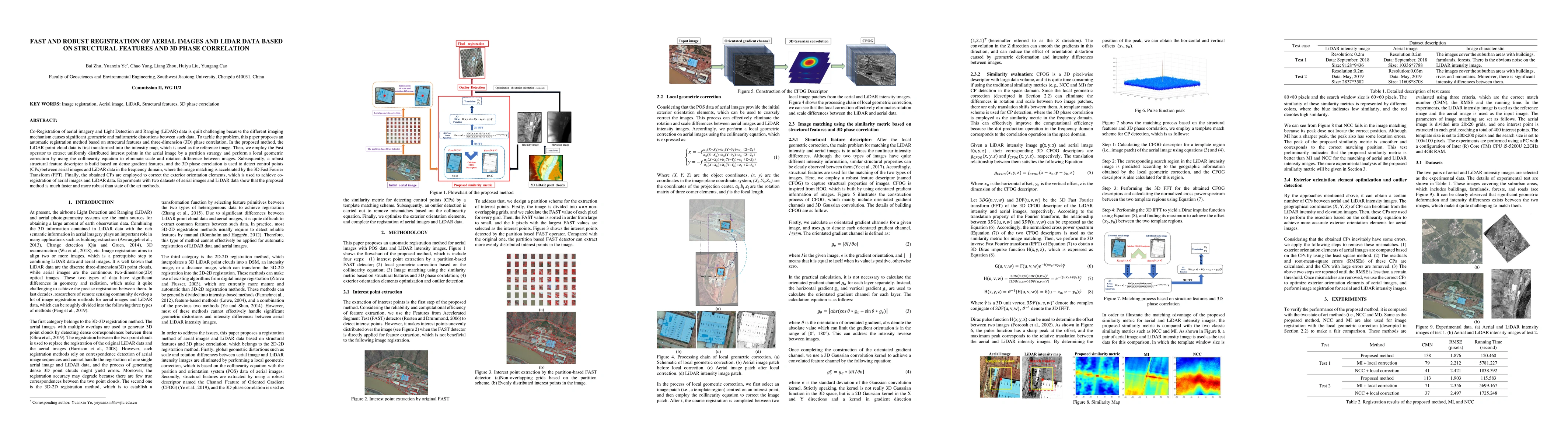 Co-Registration of aerial imagery and Light Detection and Ranging (LiDAR) data is quilt challenging because the different imaging mechanism causes significant geometric and radiometric distortions between such data. To tackle the problem, this paper proposes an automatic registration method based on structural features and three-dimension (3D) phase correlation. In the proposed method, the LiDAR point cloud data is first transformed into the intensity map, which is used as the reference image. Then, we employ the Fast operator to extract uniformly distributed interest points in the aerial image by a partition strategy and perform a local geometric correction by using the collinearity equation to eliminate scale and rotation difference between images. Subsequently, a robust structural feature descriptor is build based on dense gradient features, and the 3D phase correlation is used to detect control points (CPs) between aerial images and LiDAR data in the frequency domain, where the image matching is accelerated by the 3D Fast Fourier Transform (FFT). Finally, the obtained CPs are employed to correct the exterior orientation elements, which is used to achieve co-registration of aerial images and LiDAR data. Experiments with two datasets of aerial images and LiDAR data show that the proposed method is much faster and more robust than state of the art methods
