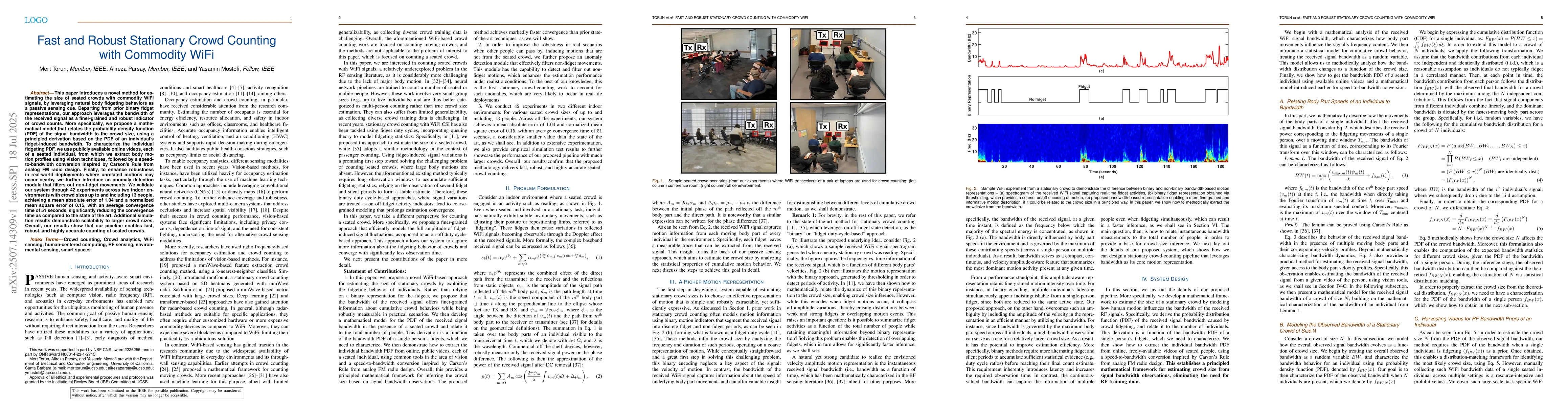 This paper introduces a novel method for estimating the size of seated crowds with commodity WiFi signals, by leveraging natural body fidgeting behaviors as a passive sensing cue. Departing from prior binary fidget representations, our approach leverages the bandwidth of the received signal as a finer-grained and robust indicator of crowd counts. More specifically, we propose a mathematical model that relates the probability density function (PDF) of the signal bandwidth to the crowd size, using a principled derivation based on the PDF of an individual's fidget-induced bandwidth. To characterize the individual fidgeting PDF, we use publicly available online videos, each of a seated individual, from which we extract body motion profiles using vision techniques, followed by a speed-to-bandwidth conversion inspired by Carson's Rule from analog FM radio design. Finally, to enhance robustness in real-world deployments where unrelated motions may occur nearby, we further introduce an anomaly detection module that filters out non-fidget movements. We validate our system through 42 experiments across two indoor environments with crowd sizes up to and including 13 people, achieving a mean absolute error of 1.04 and a normalized mean square error of 0.15, with an average convergence time of 51 seconds, significantly reducing the convergence time as compared to the state of the art. Additional simulation results demonstrate scalability to larger crowd sizes. Overall, our results show that our pipeline enables fast, robust, and highly accurate counting of seated crowds.