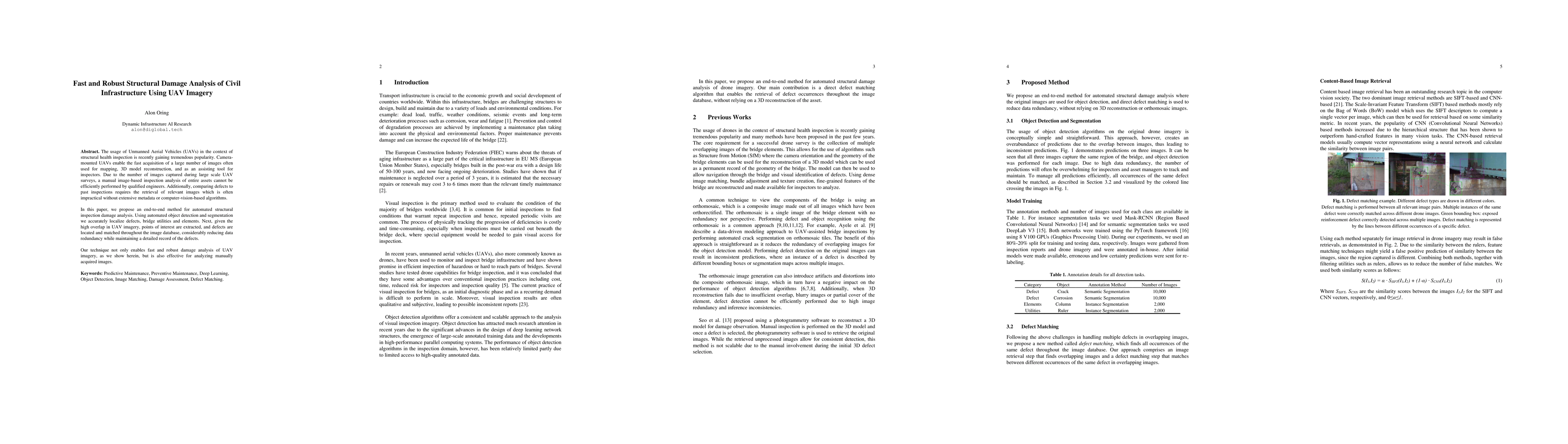 This paper proposes an automated method for structural damage analysis using UAV imagery, employing object detection and segmentation to localize defects, and utilizing computer vision techniques to reduce data redundancy while maintaining a detailed defect record. The method enables efficient and robust inspection of civil infrastructure.