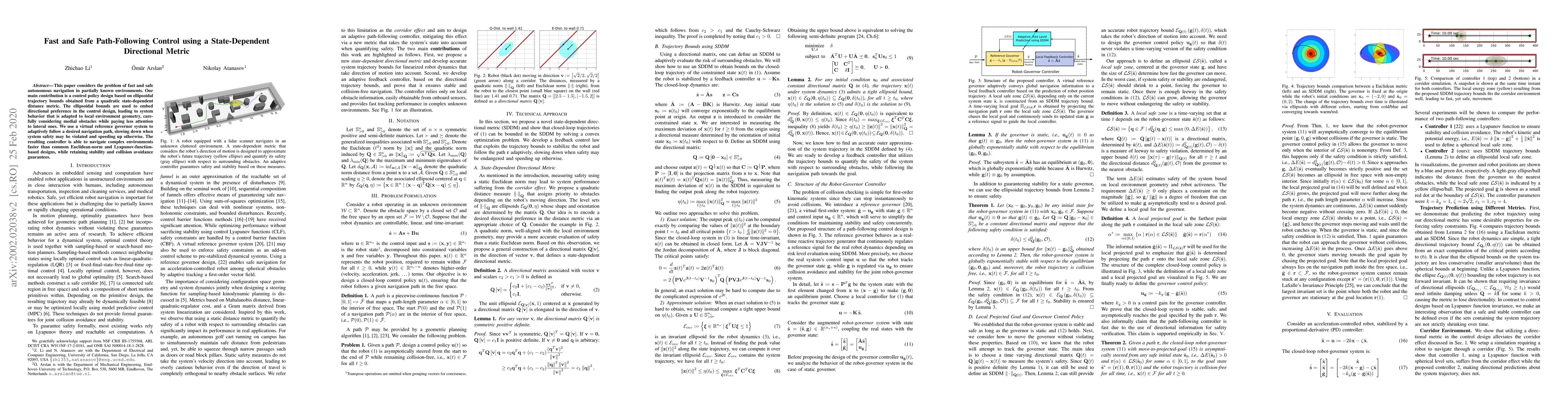 This paper considers the problem of fast and safe autonomous navigation in partially known environments. Our main contribution is a control policy design based on ellipsoidal trajectory bounds obtained from a quadratic state-dependent distance metric. The ellipsoidal bounds are used to embed directional preference in the control design, leading to system behavior that is adapted to the local environment geometry, carefully considering medial obstacles while paying less attention to lateral ones. We use a virtual reference governor system to adaptively follow a desired navigation path, slowing down when system safety may be violated and speeding up otherwise. The resulting controller is able to navigate complex environments faster than common Euclidean-norm and Lyapunov-function-based designs, while retaining stability and collision avoidance guarantees.