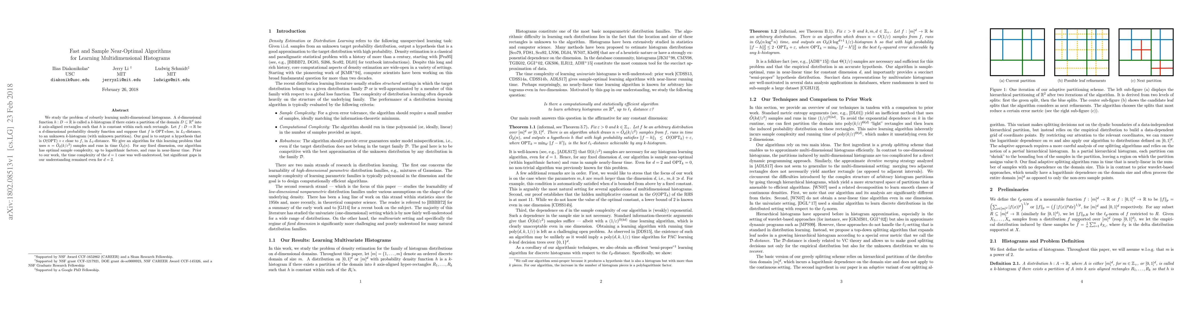 This paper presents an algorithm for learning multidimensional histograms with near-optimal sample complexity and fast running time, solving a long-standing problem in machine learning.