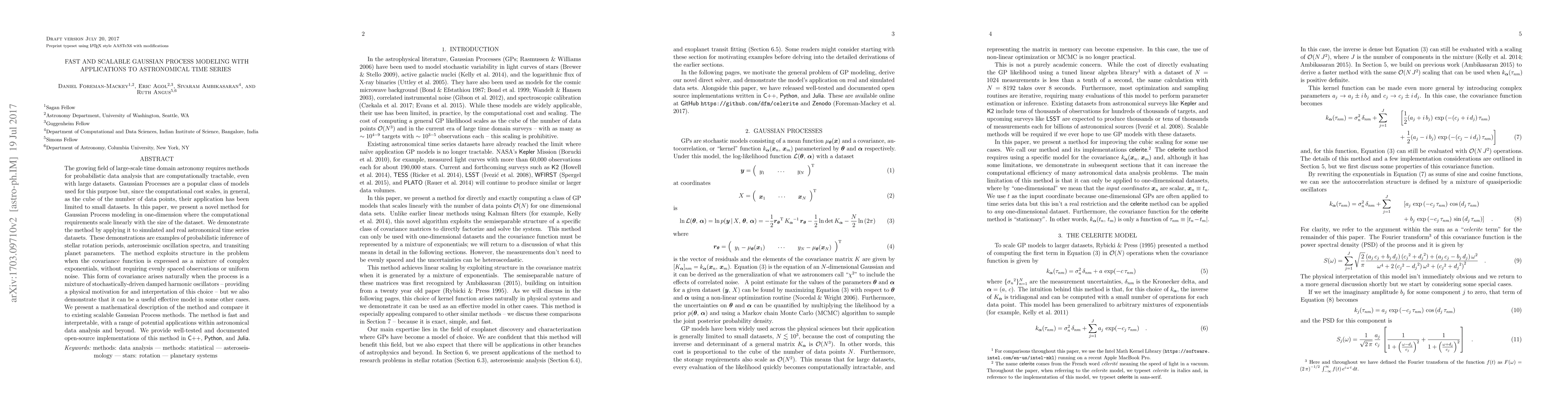 The paper introduces a novel method for Gaussian Process modeling in one-dimension, where computational requirements scale linearly with dataset size, utilizing a covariance function expressed as a mixture of complex exponentials. This method is demonstrated on simulated and real astronomical time series datasets, including stellar rotation periods, asteroseismic oscillation spectra, and transiting planet parameters.