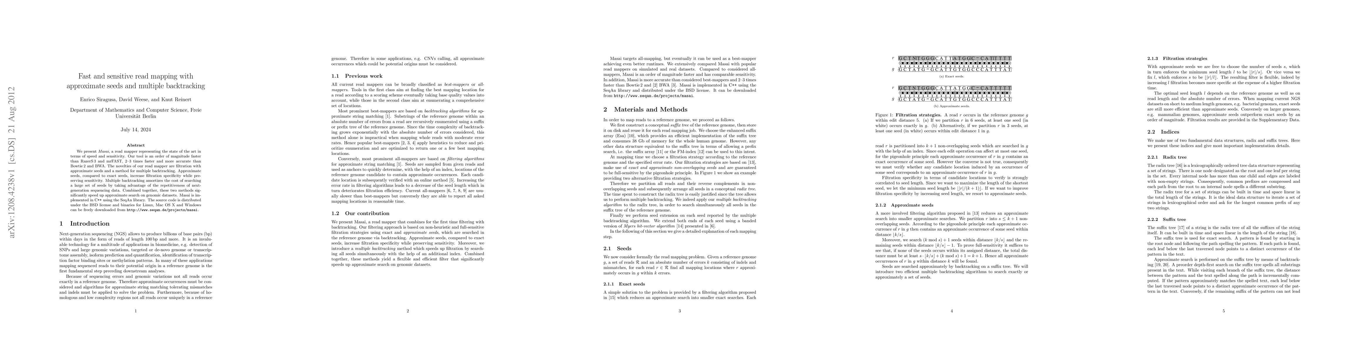 Masai is a state-of-the-art read mapper that significantly outperforms existing tools in speed and sensitivity, utilizing approximate seeds and multiple backtracking to enhance performance on genomic datasets. The tool is available for free download and is implemented in C++ using the SeqAn library.