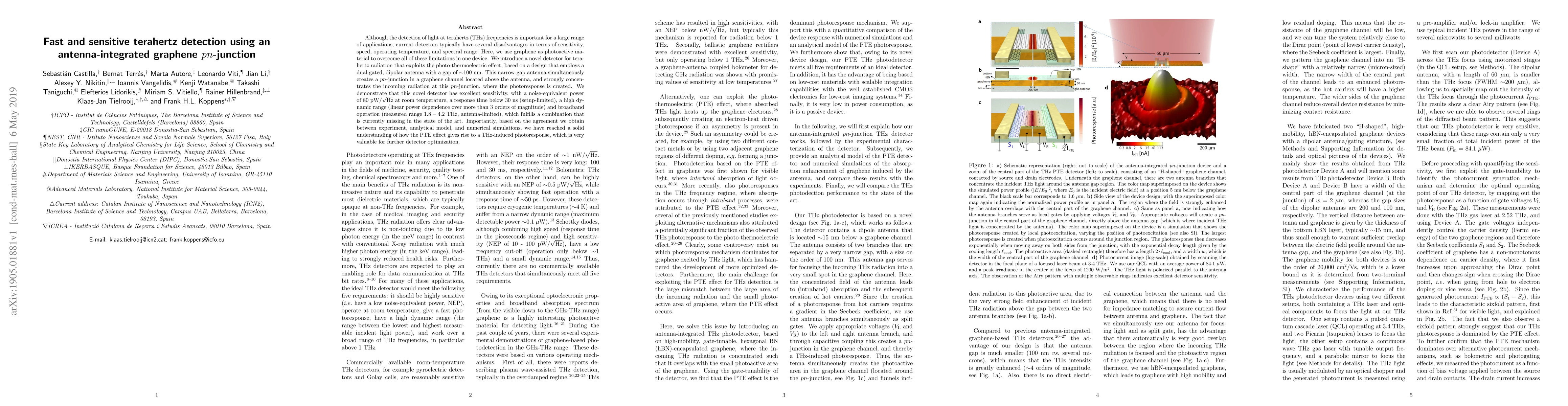 This paper presents a novel graphene-based terahertz detector with high sensitivity and speed, utilizing a photothermoelectric effect in a dual-gated antenna-integrated graphene pn junction. The detector exhibits a noise-equivalent power of 80 pW-per-square-root-Hz, a response time below 30 ns, and broadband operation from 1.8 to 4.2 THz, surpassing current state-of-the-art detectors.