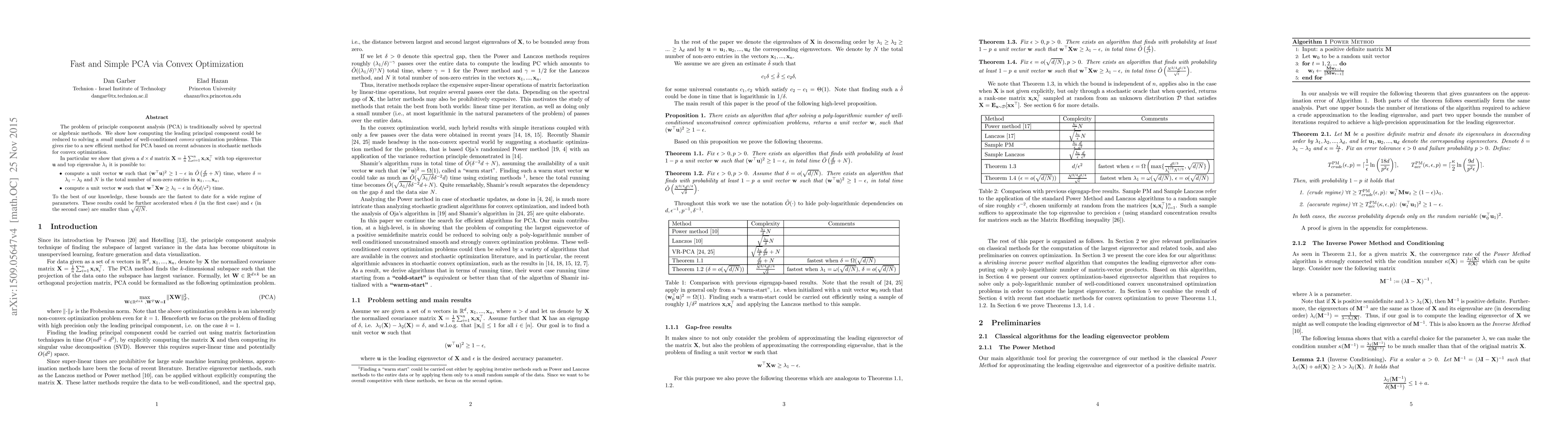 This research introduces a novel, efficient method for Principal Component Analysis (PCA) by reducing the problem to solving small convex optimization problems. It presents faster-than-previous-bounds algorithms for computing a unit vector approximating the top eigenvector of a given matrix, with one algorithm running in O(d/ε^2) time, significantly enhancing PCA's computational speed for large datasets.