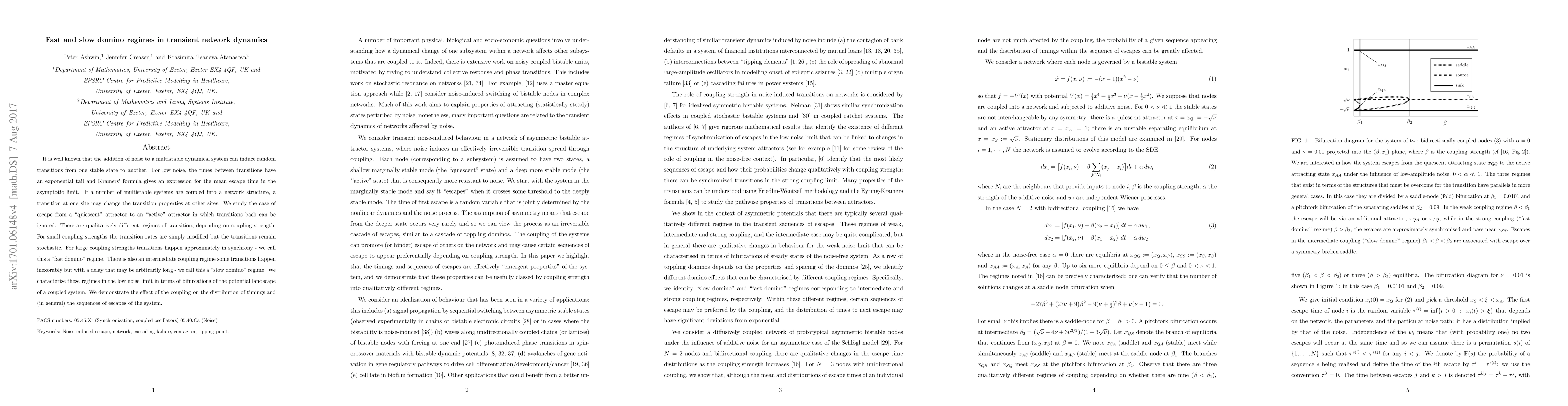 It is well known that the addition of noise to a multistable dynamical system can induce random transitions from one stable state to another. For low noise, the times between transitions have an exponential tail and Kramers' formula gives an expression for the mean escape time in the asymptotic limit. If a number of multistable systems are coupled into a network structure, a transition at one site may change the transition properties at other sites. We study the case of escape from a "quiescent" attractor to an "active" attractor in which transitions back can be ignored. There are qualitatively different regimes of transition, depending on coupling strength. For small coupling strengths the transition rates are simply modified but the transitions remain stochastic. For large coupling strengths transitions happen approximately in synchrony - we call this a "fast domino" regime. There is also an intermediate coupling regime some transitions happen inexorably but with a delay that may be arbitrarily long - we call this a "slow domino" regime. We characterise these regimes in the low noise limit in terms of bifurcations of the potential landscape of a coupled system. We demonstrate the effect of the coupling on the distribution of timings and (in general) the sequences of escapes of the system.