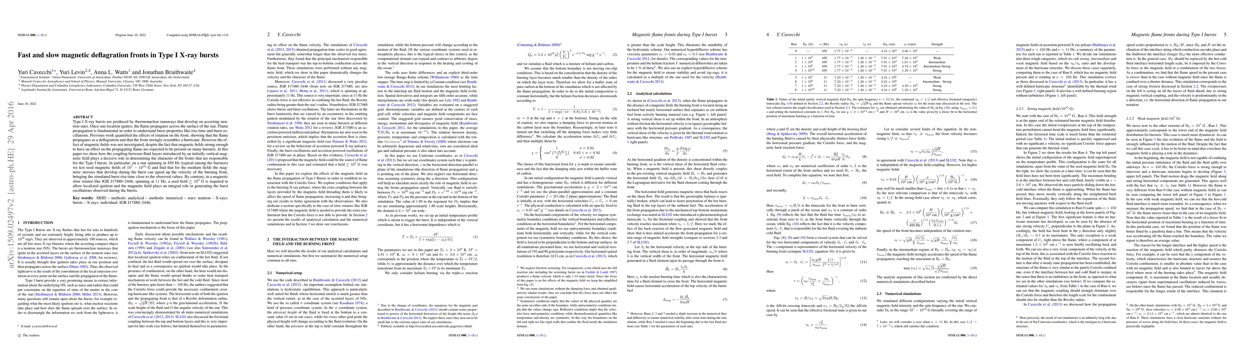Type I X-ray bursts are produced by thermonuclear runaways that develop on accreting neutron stars. Once one location ignites, the flame propagates across the surface of the star. Flame propagation is fundamental in order to understand burst properties like rise time and burst oscillations. Previous work quantified the effects of rotation on the front, showing that the flame propagates as a deflagration and that the front strongly resembles a hurricane. However the effect of magnetic fields was not investigated, despite the fact that magnetic fields strong enough to have an effect on the propagating flame are expected to be present on many bursters. In this paper we show how the coupling between fluid layers introduced by an initially vertical magnetic field plays a decisive role in determining the character of the fronts that are responsible for the Type I bursts. In particular, on a star spinning at 450 Hz (typical among the bursters) we test seed magnetic fields of $10^{7} - 10^{10}$ G and find that for the medium fields the magnetic stresses that develop during the burst can speed up the velocity of the burning front, bringing the simulated burst rise time close to the observed values. By contrast, in a magnetic slow rotator like IGR J17480--2446, spinning at 11 Hz, a seed field $\gtrsim 10^9$ G is required to allow localized ignition and the magnetic field plays an integral role in generating the burst oscillations observed during the bursts.