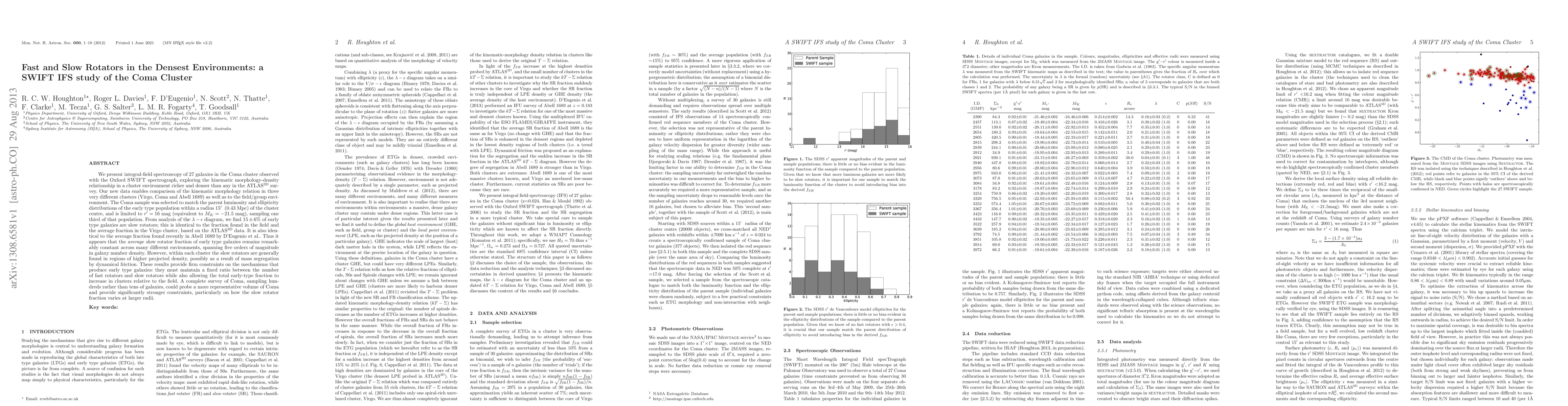 We present integral-field spectroscopy of 27 galaxies in the Coma cluster observed with the Oxford SWIFT spectrograph, exploring the kinematic morphology-density relationship in a cluster environment richer and denser than any in the ATLAS3D survey. Our new data enables comparison of the kinematic morphology relation in three very different clusters (Virgo, Coma and Abell 1689) as well as to the field/group environment. The Coma sample was selected to match the parent luminosity and ellipticity distributions of the early-type population within a radius 15' (0.43 Mpc) of the cluster centre, and is limited to r' = 16 mag (equivalent to M_K = -21.5 mag), sampling one third of that population. From analysis of the lambda-ellipticity diagram, we find 15+-6% of early-type galaxies are slow rotators; this is identical to the fraction found in the field and the average fraction in the Virgo cluster, based on the ATLAS3D data. It is also identical to the average fraction found recently in Abell 1689 by D'Eugenio et al.. Thus it appears that the average slow rotator fraction of early type galaxies remains remarkably constant across many different environments, spanning five orders of magnitude in galaxy number density. However, within each cluster the slow rotators are generally found in regions of higher projected density, possibly as a result of mass segregation by dynamical friction. These results provide firm constraints on the mechanisms that produce early-type galaxies: they must maintain a fixed ratio between the number of fast rotators and slow rotators while also allowing the total early-type fraction to increase in clusters relative to the field. A complete survey of Coma, sampling hundreds rather than tens of galaxies, could probe a more representative volume of Coma and provide significantly stronger constraints, particularly on how the slow rotator fraction varies at larger radii.