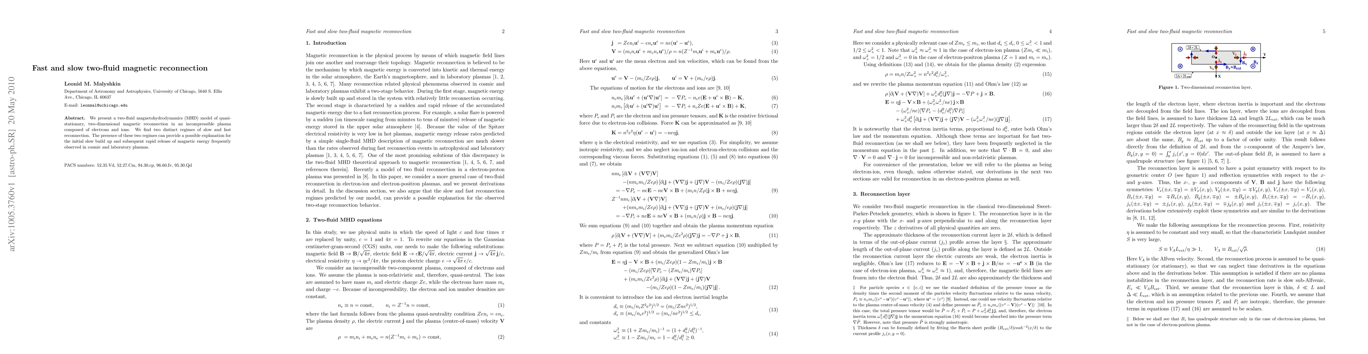 This paper introduces a two-fluid magnetohydrodynamics model to study magnetic reconnection in plasmas, identifying two distinct reconnection regimes: slow and fast. These findings may explain the observed initial slow and subsequent rapid release of magnetic energy in cosmic and laboratory plasmas.