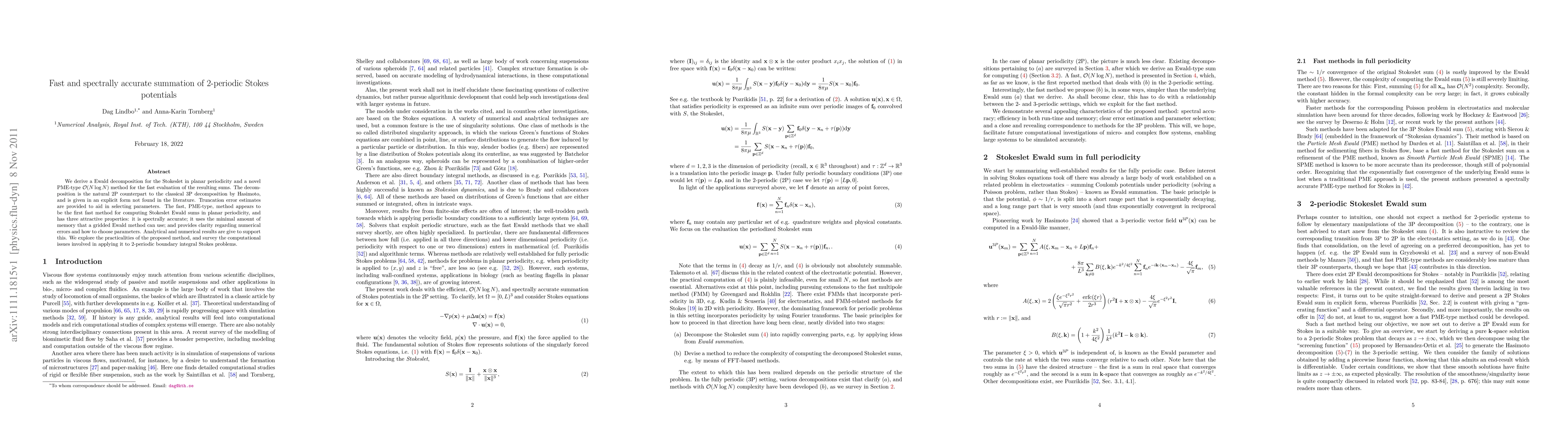 This paper presents a novel O(N log N) method for efficiently computing 2-periodic Stokes potentials using a new Ewald decomposition and a PME-type approach. The method is spectrally accurate, uses minimal memory, and provides clear guidance on parameter selection and numerical error management.