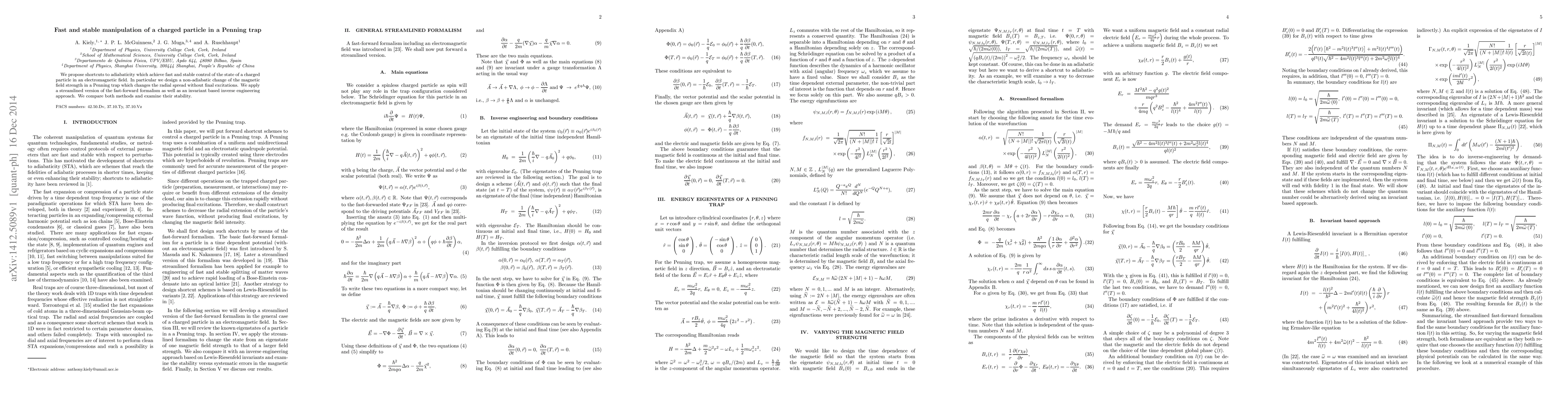 We propose shortcuts to adiabaticity which achieve fast and stable control of the state of a charged particle in an electromagnetic field. In particular we design a non-adiabatic change of the magnetic field strength in a Penning trap which changes the radial spread without final excitations. We apply a streamlined version of the fast-forward formalism as well as an invariant based inverse engineering approach. We compare both methods and examine their stability.