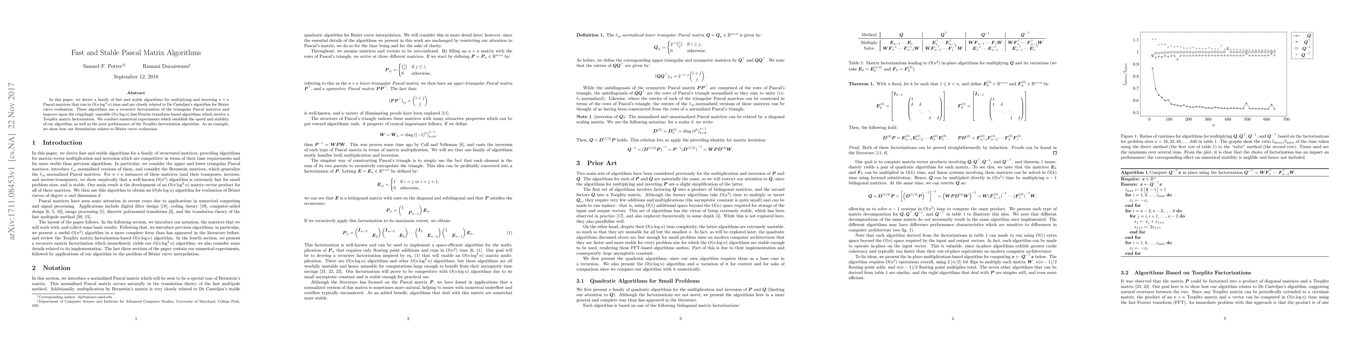 In this paper, we derive a family of fast and stable algorithms for multiplying and inverting $n \times n$ Pascal matrices that run in $O(n log^2 n)$ time and are closely related to De Casteljau's algorithm for B\'ezier curve evaluation. These algorithms use a recursive factorization of the triangular Pascal matrices and improve upon the cripplingly unstable $O(n log n)$ fast Fourier transform-based algorithms which involve a Toeplitz matrix factorization. We conduct numerical experiments which establish the speed and stability of our algorithm, as well as the poor performance of the Toeplitz factorization algorithm. As an example, we show how our formulation relates to B\'ezier curve evaluation.