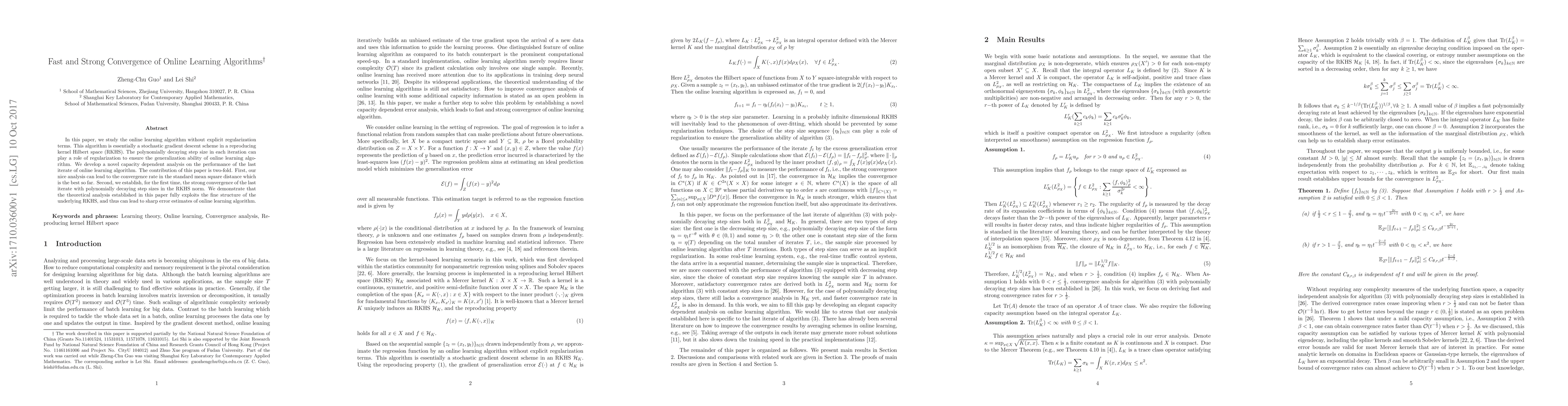 In this paper, we study the online learning algorithm without explicit regularization terms. This algorithm is essentially a stochastic gradient descent scheme in a reproducing kernel Hilbert space (RKHS). The polynomially decaying step size in each iteration can play a role of regularization to ensure the generalization ability of online learning algorithm. We develop a novel capacity dependent analysis on the performance of the last iterate of online learning algorithm. The contribution of this paper is two-fold. First, our nice analysis can lead to the convergence rate in the standard mean square distance which is the best so far. Second, we establish, for the first time, the strong convergence of the last iterate with polynomially decaying step sizes in the RKHS norm. We demonstrate that the theoretical analysis established in this paper fully exploits the fine structure of the underlying RKHS, and thus can lead to sharp error estimates of online learning algorithm.