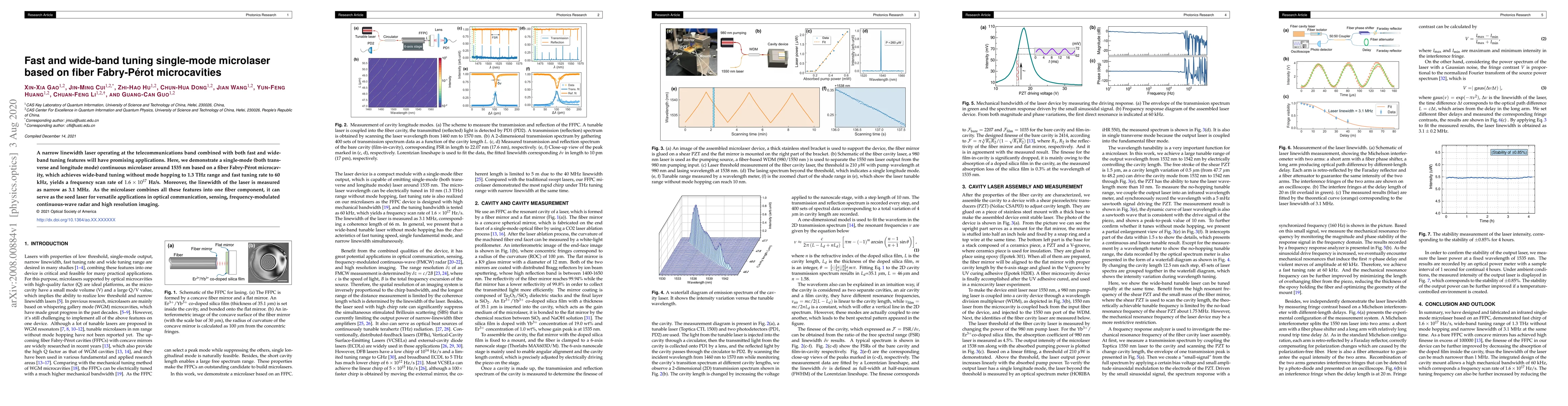 This paper presents a single-mode microlaser based on fiber Fabry-Pérot microcavities that offers fast tuning up to 60 kHz and wide-band tuning up to 1.3 THz, with a narrow linewidth of 3.1 MHz, suitable for applications in optical communication and sensing.