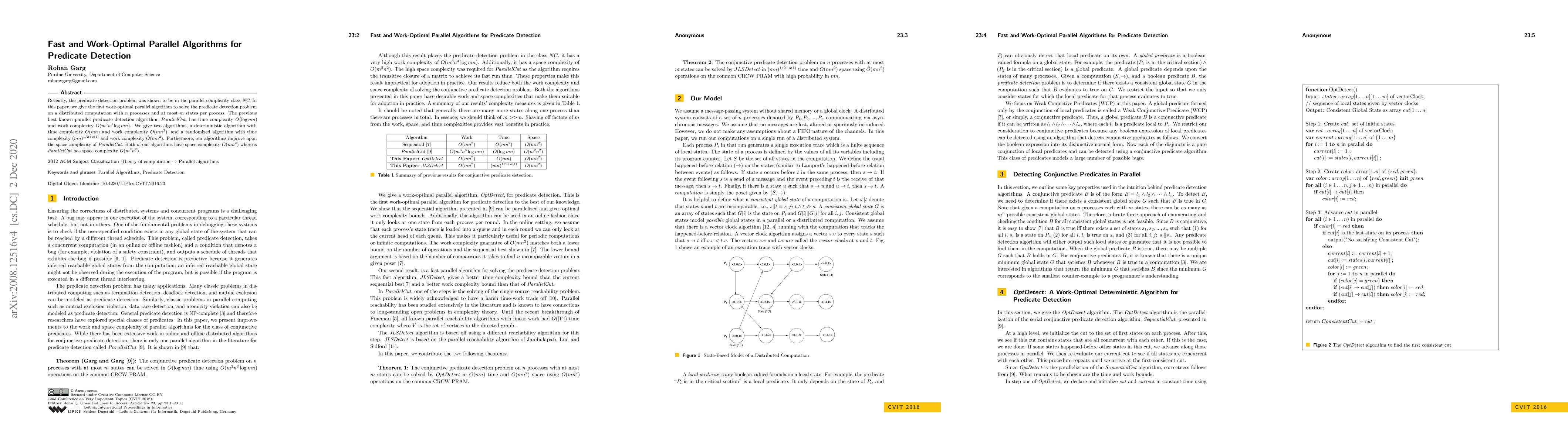 Recently, the predicate detection problem was shown to be in the parallel complexity class NC. In this paper, we give the first work-optimal parallel algorithm to solve the predicate detection problem on a distributed computation with $n$ processes and at most $m$ states per process. The previous best known parallel predicate detection algorithm, ParallelCut, has time complexity $O(\log mn)$ and work complexity $O(m^3n^3\log mn)$. We give two algorithms, a deterministic algorithm with time complexity $O(mn)$ and work complexity $O(mn^2)$, and a randomized algorithm with time complexity $(mn)^{1/2 + o(1)}$ and work complexity $\tilde{O}(mn^2)$. Furthermore, our algorithms improve upon the space complexity of ParallelCut. Both of our algorithms have space complexity $O(mn^2)$ whereas ParallelCut has space complexity $O(m^2n^2)$.