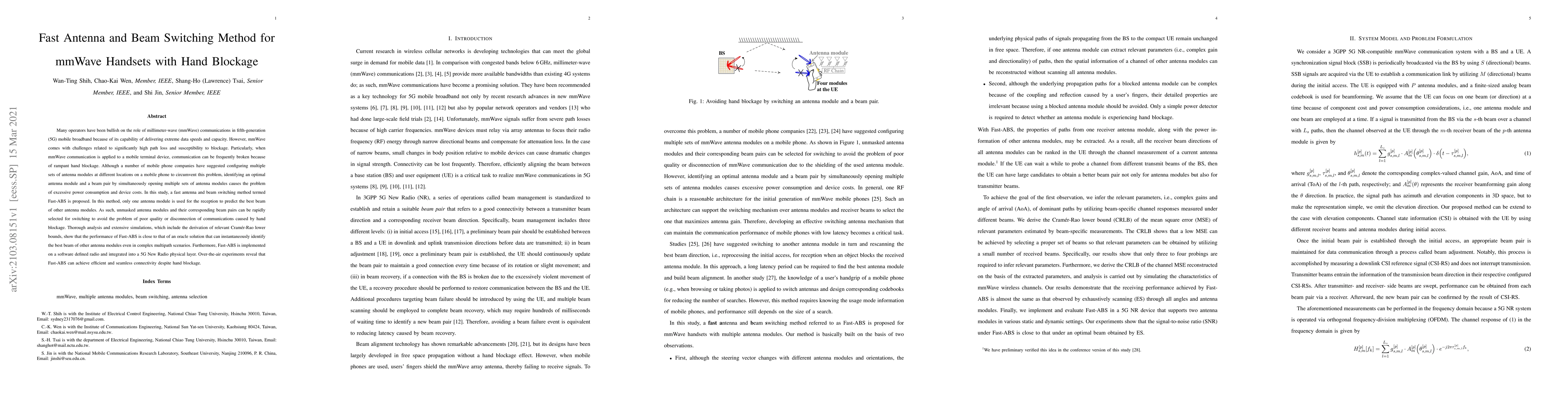This paper proposes a Fast Antenna and Beam Switching (Fast-ABS) method to address the communication disruptions caused by hand blockage in mmWave 5G handsets. Fast-ABS uses only one antenna module for reception to predict the best beam for others, enabling rapid selection of optimal beams to maintain connectivity, with minimal power consumption and cost.