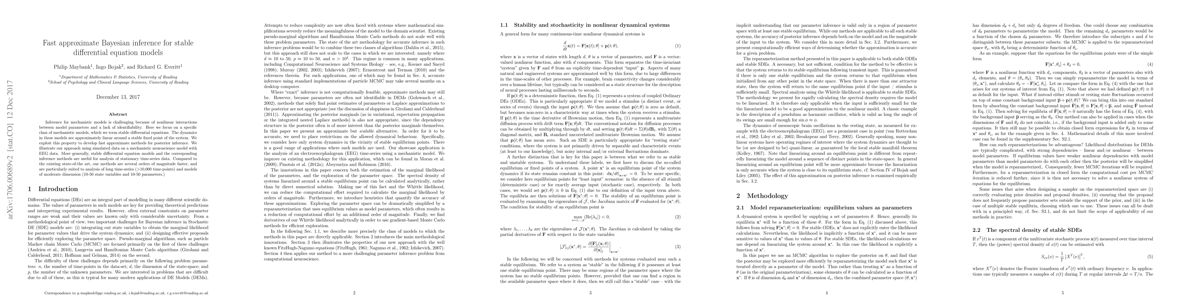Inference for mechanistic models is challenging because of nonlinear interactions between model parameters and a lack of identifiability. Here we focus on a specific class of mechanistic models, which we term stable differential equations. The dynamics in these models are approximately linear around a stable fixed point of the system. We exploit this property to develop fast approximate methods for posterior inference. We illustrate our approach using simulated data on a mechanistic neuroscience model with EEG data. More generally, stable differential equation models and the corresponding inference methods are useful for analysis of stationary time-series data. Compared to the existing state-of-the art, our methods are several orders of magnitude faster, and are particularly suited to analysis of long time-series (>10,000 time-points) and models of moderate dimension (10-50 state variables and 10-50 parameters.)