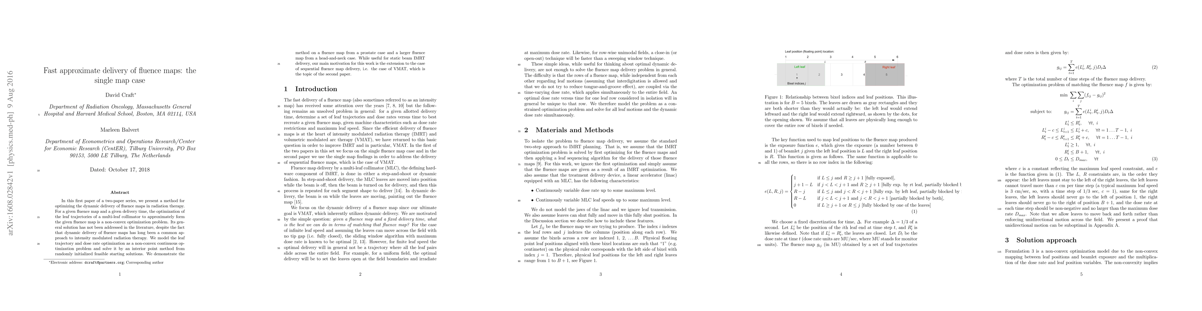 In this first paper of a two-paper series, we present a method for optimizing the dynamic delivery of fluence maps in radiation therapy. For a given fluence map and a given delivery time, the optimization of the leaf trajectories of a multi-leaf collimator to approximately form the given fluence map is a non-convex optimization problem. Its general solution has not been addressed in the literature, despite the fact that dynamic delivery of fluence maps has long been a common approach to intensity modulated radiation therapy. We model the leaf trajectory and dose rate optimization as a non-convex continuous optimization problem and solve it by an interior point method from randomly initialized feasible starting solutions. We demonstrate the method on a fluence map from a prostate case and a larger fluence map from a head-and-neck case. While useful for static beam IMRT delivery, our main motivation for this work is the extension to the case of sequential fluence map delivery, i.e. the case of VMAT, which is the topic of the second paper.