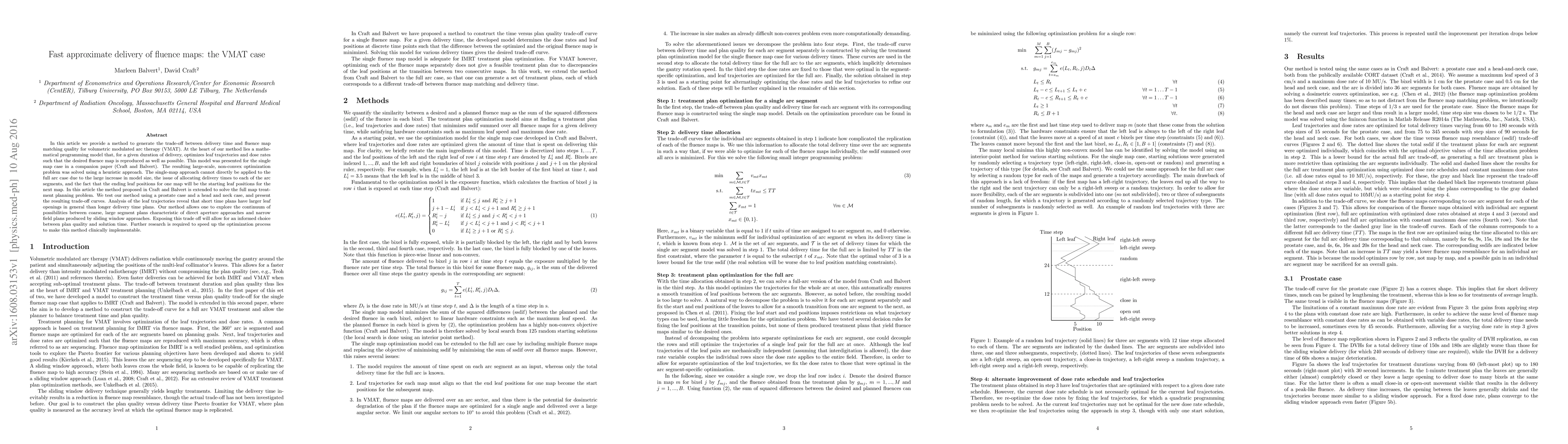 This paper presents a method to balance delivery time and fluence map matching quality for volumetric modulated arc therapy (VMAT) by optimizing leaf trajectories and dose rates. The approach extends a previously developed single-map method to handle full arc cases, allowing exploration of trade-offs between plan quality and solution time, though further optimization is needed for clinical implementation.