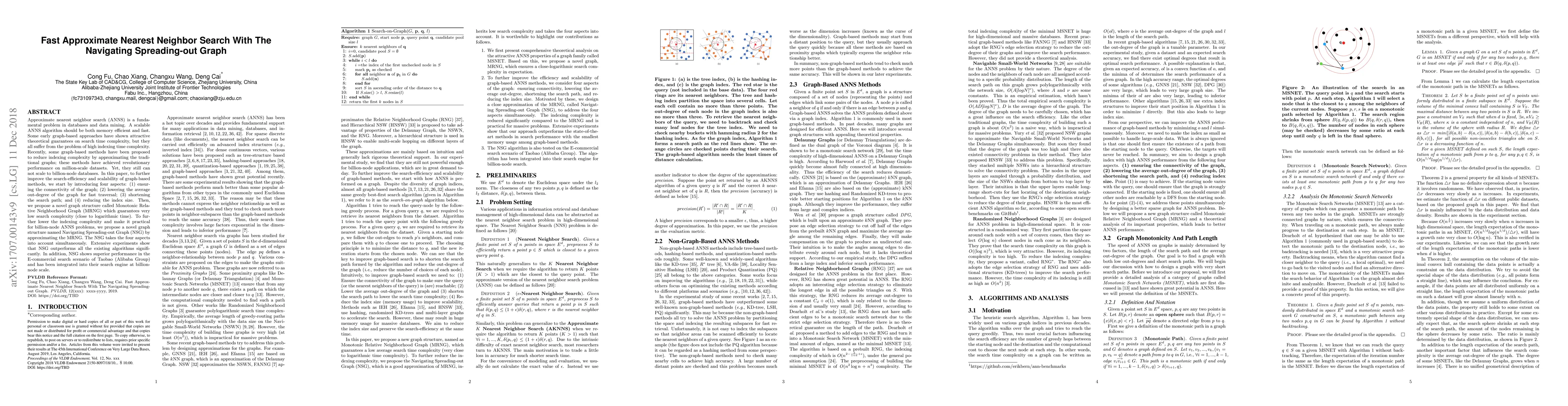 This paper proposes the Navigating Spreading-out Graph (NSG) to improve the scalability and efficiency of approximate nearest neighbor search (ANNS) by addressing four key aspects: graph connectivity, low average out-degree, shorter search paths, and reduced index size. NSG significantly outperforms existing algorithms in extensive experiments and has been successfully deployed at Taobao for billion-node search tasks.
