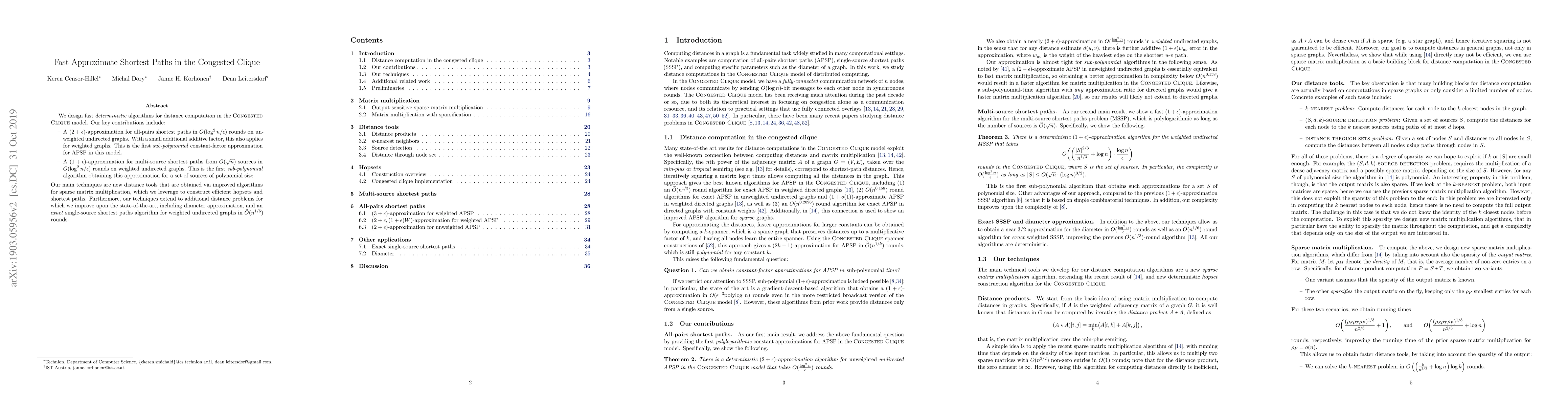 We design fast deterministic algorithms for distance computation in the congested clique model. Our key contributions include: -- A $(2+\epsilon)$-approximation for all-pairs shortest paths in $O(\log^2{n} / \epsilon)$ rounds on unweighted undirected graphs. With a small additional additive factor, this also applies for weighted graphs. This is the first sub-polynomial constant-factor approximation for APSP in this model. -- A $(1+\epsilon)$-approximation for multi-source shortest paths from $O(\sqrt{n})$ sources in $O(\log^2{n} / \epsilon)$ rounds on weighted undirected graphs. This is the first sub-polynomial algorithm obtaining this approximation for a set of sources of polynomial size. Our main techniques are new distance tools that are obtained via improved algorithms for sparse matrix multiplication, which we leverage to construct efficient hopsets and shortest paths. Furthermore, our techniques extend to additional distance problems for which we improve upon the state-of-the-art, including diameter approximation, and an exact single-source shortest paths algorithm for weighted undirected graphs in $\tilde{O}(n^{1/6})$ rounds.
