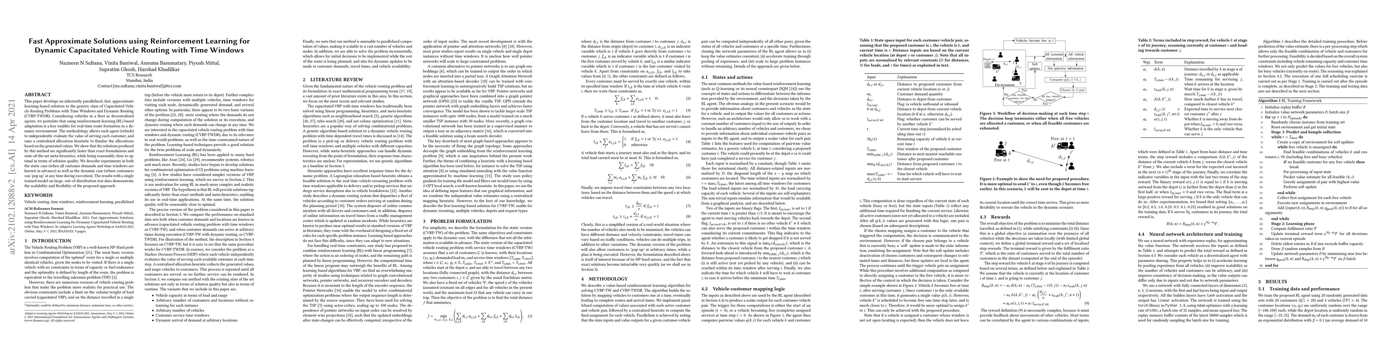 This paper proposes a reinforcement learning-based method for solving dynamic capacitated vehicle routing problems with time windows, achieving fast, approximate solutions that outperform exact methods and meta-heuristics. The approach scales well and maintains solution quality across both static and dynamic environments.