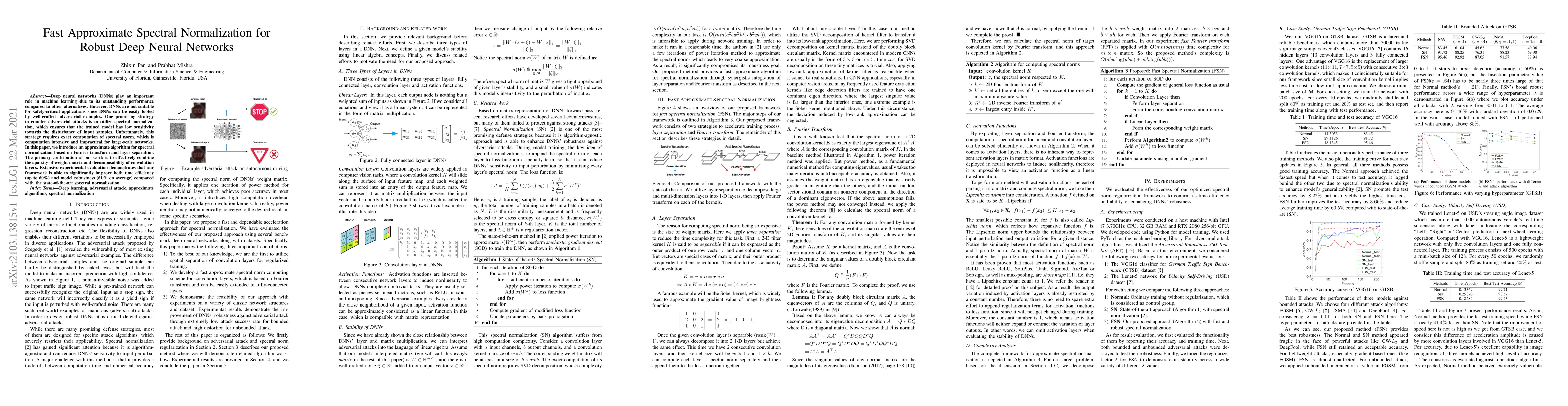 Deep neural networks (DNNs) play an important role in machine learning due to its outstanding performance compared to other alternatives. However, DNNs are not suitable for safety-critical applications since DNNs can be easily fooled by well-crafted adversarial examples. One promising strategy to counter adversarial attacks is to utilize spectral normalization, which ensures that the trained model has low sensitivity towards the disturbance of input samples. Unfortunately, this strategy requires exact computation of spectral norm, which is computation intensive and impractical for large-scale networks. In this paper, we introduce an approximate algorithm for spectral normalization based on Fourier transform and layer separation. The primary contribution of our work is to effectively combine the sparsity of weight matrix and decomposability of convolution layers. Extensive experimental evaluation demonstrates that our framework is able to significantly improve both time efficiency (up to 60\%) and model robustness (61\% on average) compared with the state-of-the-art spectral normalization.
