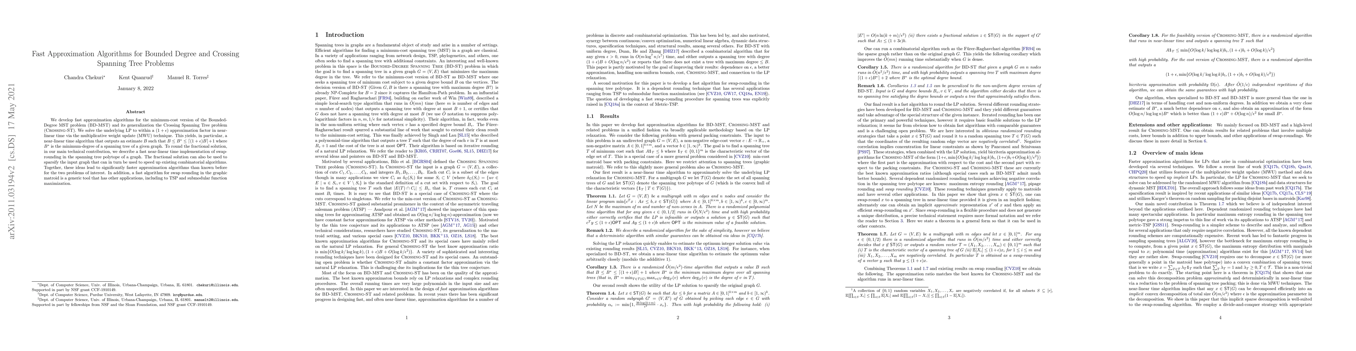 This paper presents fast approximation algorithms for the Bounded-Degree MST problem and the Crossing Spanning Tree problem, achieving near-linear time complexity. The authors utilize the multiplicative weight update technique to solve the underlying LP and describe a novel near-linear time swap-rounding method for the spanning tree polytope.