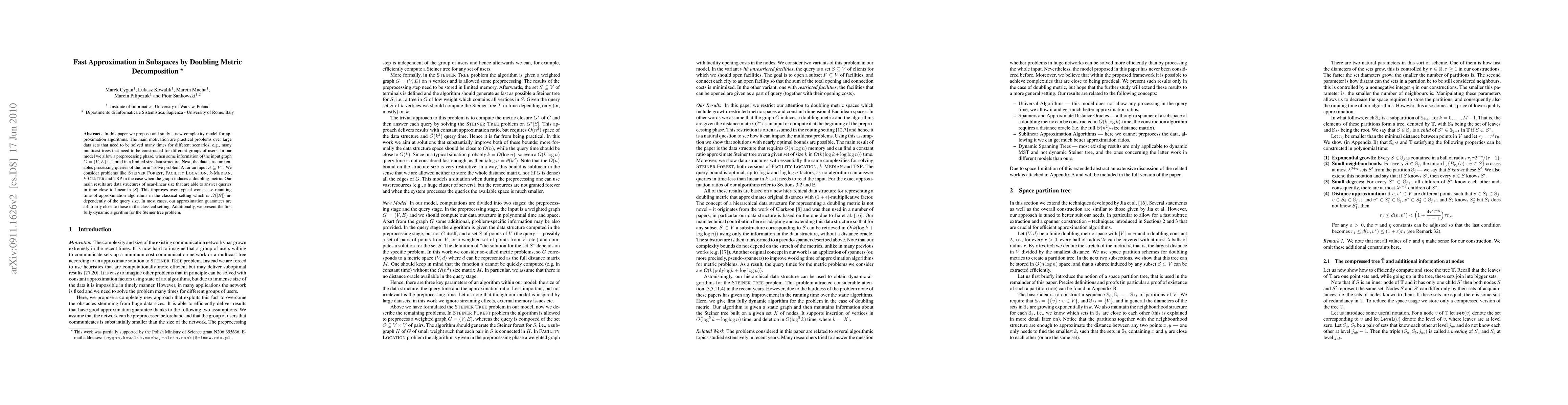 In this paper we propose and study a new complexity model for approximation algorithms. The main motivation are practical problems over large data sets that need to be solved many times for different scenarios, e.g., many multicast trees that need to be constructed for different groups of users. In our model we allow a preprocessing phase, when some information of the input graph $G=(V,E)$ is stored in a limited size data structure. Next, the data structure enables processing queries of the form ``solve problem A for an input $S\subseteq V$''. We consider problems like {\sc Steiner Forest}, {\sc Facility Location}, {\sc $k$-Median}, {\sc $k$-Center} and {\sc TSP} in the case when the graph induces a doubling metric. Our main results are data structures of near-linear size that are able to answer queries in time close to linear in $|S|$. This improves over typical worst case reuniting time of approximation algorithms in the classical setting which is $\Omega(|E|)$ independently of the query size. In most cases, our approximation guarantees are arbitrarily close to those in the classical setting. Additionally, we present the first fully dynamic algorithm for the Steiner tree problem.