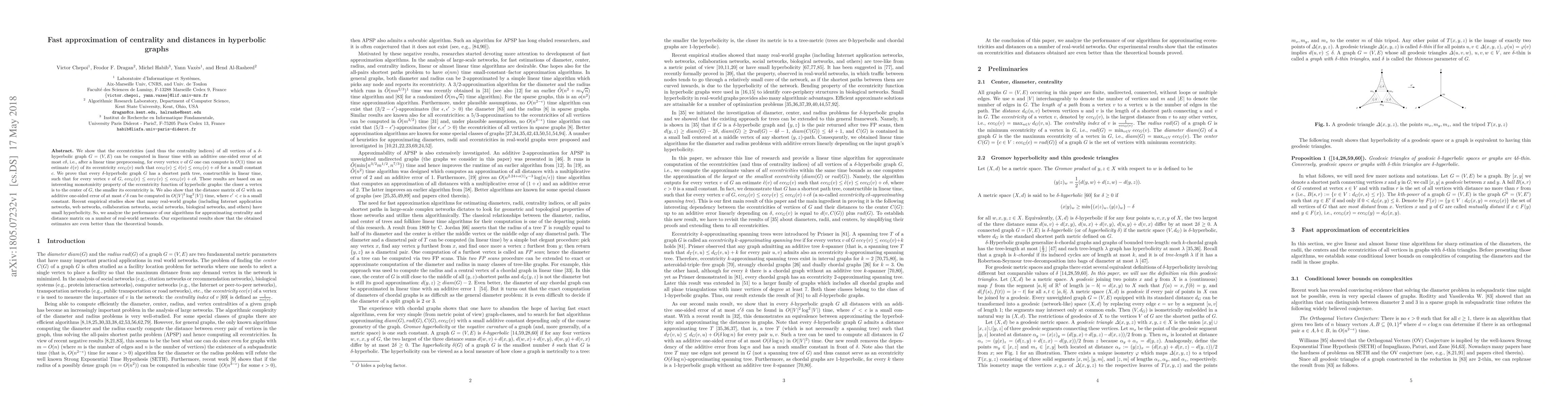 We show that the eccentricities (and thus the centrality indices) of all vertices of a $\delta$-hyperbolic graph $G=(V,E)$ can be computed in linear time with an additive one-sided error of at most $c\delta$, i.e., after a linear time preprocessing, for every vertex $v$ of $G$ one can compute in $O(1)$ time an estimate $\hat{e}(v)$ of its eccentricity $ecc_G(v)$ such that $ecc_G(v)\leq \hat{e}(v)\leq ecc_G(v)+ c\delta$ for a small constant $c$. We prove that every $\delta$-hyperbolic graph $G$ has a shortest path tree, constructible in linear time, such that for every vertex $v$ of $G$, $ecc_G(v)\leq ecc_T(v)\leq ecc_G(v)+ c\delta$. These results are based on an interesting monotonicity property of the eccentricity function of hyperbolic graphs: the closer a vertex is to the center of $G$, the smaller its eccentricity is. We also show that the distance matrix of $G$ with an additive one-sided error of at most $c'\delta$ can be computed in $O(|V|^2\log^2|V|)$ time, where $c'< c$ is a small constant. Recent empirical studies show that many real-world graphs (including Internet application networks, web networks, collaboration networks, social networks, biological networks, and others) have small hyperbolicity. So, we analyze the performance of our algorithms for approximating centrality and distance matrix on a number of real-world networks. Our experimental results show that the obtained estimates are even better than the theoretical bounds.