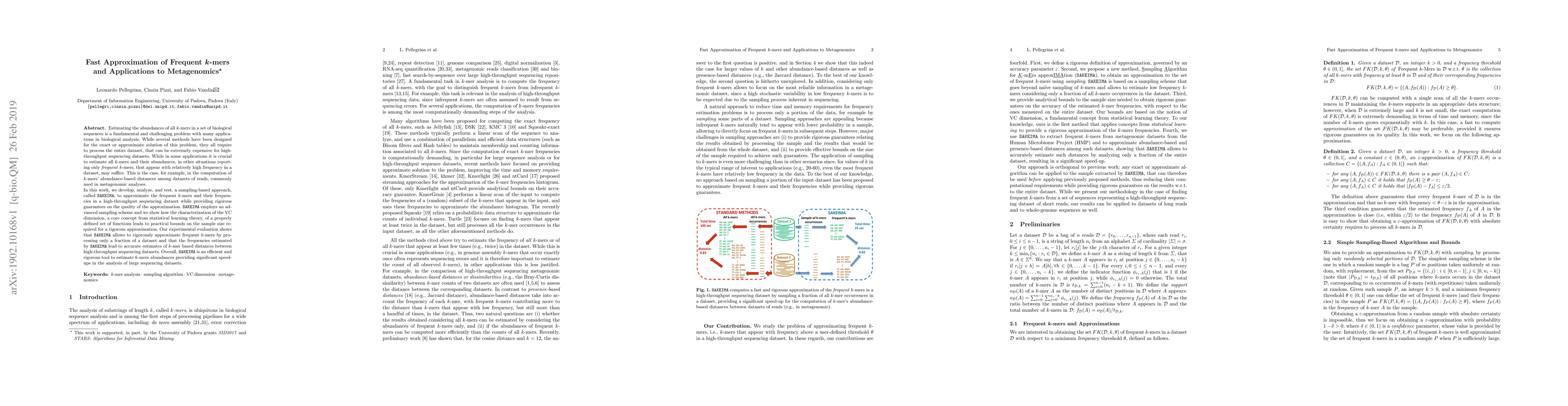 This paper introduces SAKEIMA, a sampling-based method for approximating frequent $k$-mers and their frequencies in high-throughput sequencing datasets, providing rigorous approximation guarantees. Experimental results show SAKEIMA efficiently estimates $k$-mer abundances by processing only a fraction of the dataset, enabling accurate computation of $k$-mer based distances in metagenomic analyses.