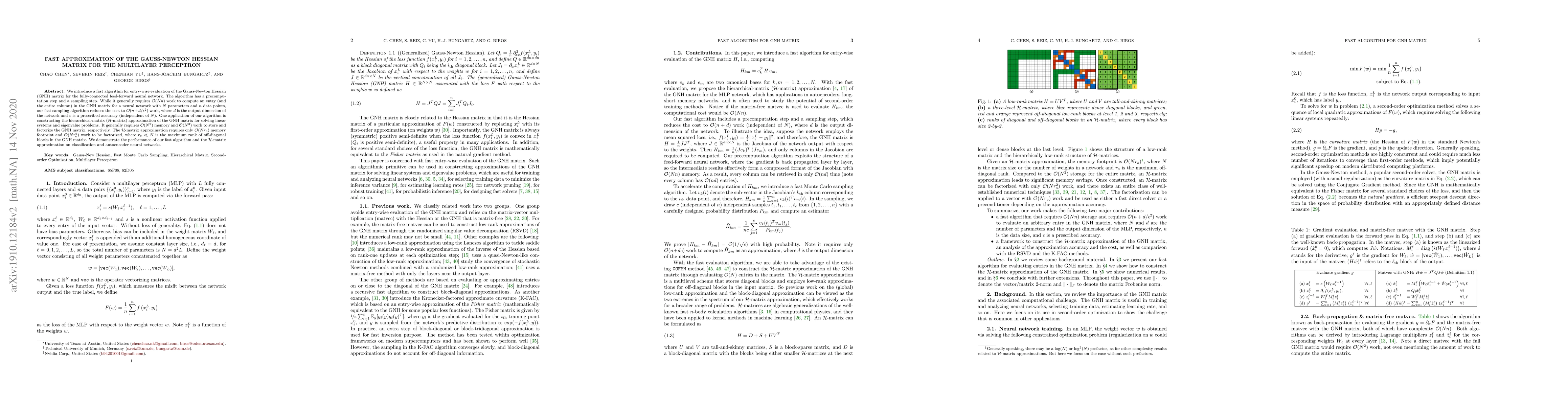 We introduce a fast algorithm for entry-wise evaluation of the Gauss-Newton Hessian (GNH) matrix for the fully-connected feed-forward neural network. The algorithm has a precomputation step and a sampling step. While it generally requires $O(Nn)$ work to compute an entry (and the entire column) in the GNH matrix for a neural network with $N$ parameters and $n$ data points, our fast sampling algorithm reduces the cost to $O(n+d/\epsilon^2)$ work, where $d$ is the output dimension of the network and $\epsilon$ is a prescribed accuracy (independent of $N$). One application of our algorithm is constructing the hierarchical-matrix (H-matrix) approximation of the GNH matrix for solving linear systems and eigenvalue problems. It generally requires $O(N^2)$ memory and $O(N^3)$ work to store and factorize the GNH matrix, respectively. The H-matrix approximation requires only $O(N r_o)$ memory footprint and $O(N r_o^2)$ work to be factorized, where $r_o \ll N$ is the maximum rank of off-diagonal blocks in the GNH matrix. We demonstrate the performance of our fast algorithm and the H-matrix approximation on classification and autoencoder neural networks.