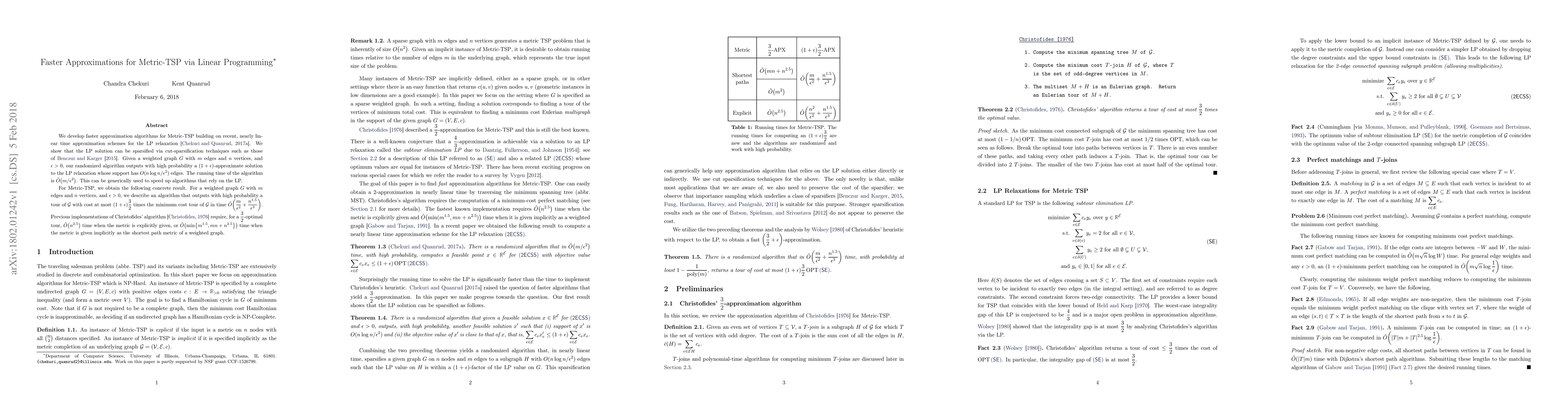 We develop faster approximation algorithms for Metric-TSP building on recent, nearly linear time approximation schemes for the LP relaxation [Chekuri and Quanrud, 2017]. We show that the LP solution can be sparsified via cut-sparsification techniques such as those of Benczur and Karger [2015]. Given a weighted graph $G$ with $m$ edges and $n$ vertices, and $\epsilon > 0$, our randomized algorithm outputs with high probability a $(1+\epsilon)$-approximate solution to the LP relaxation whose support has $\operatorname{O}(n \log n /\epsilon^2)$ edges. The running time of the algorithm is $\operatorname{\~O}(m/\epsilon^2)$. This can be generically used to speed up algorithms that rely on the LP. For Metric-TSP, we obtain the following concrete result. For a weighted graph $G$ with $m$ edges and $n$ vertices, and $\epsilon > 0$, we describe an algorithm that outputs with high probability a tour of $G$ with cost at most $(1 + \epsilon) \frac{3}{2}$ times the minimum cost tour of $G$ in time $\operatorname{\~O}(m/\epsilon^2 + n^{1.5}/\epsilon^3)$. Previous implementations of Christofides' algorithm [Christofides, 1976] require, for a $\frac{3}{2}$-optimal tour, $\operatorname{\~O}(n^{2.5})$ time when the metric is explicitly given, or $\operatorname{\~O}(\min\{m^{1.5}, mn+n^{2.5}\})$ time when the metric is given implicitly as the shortest path metric of a weighted graph.